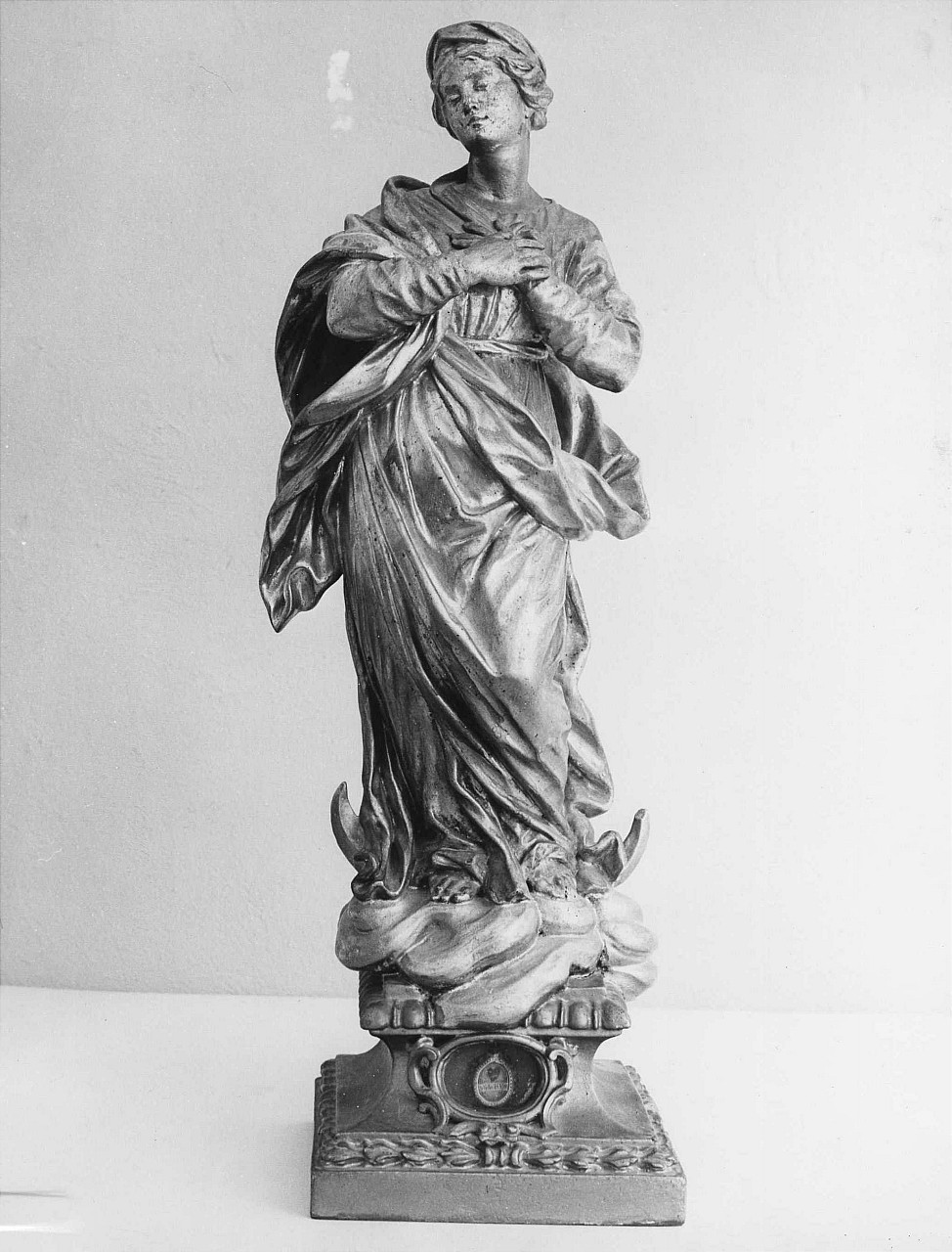 Statuetta in legno intagliato e dorato con base quadrata decorata da baccellature e teoria di fiori, sostenuta da nuvolario argentato. Alla base la reliquia del santo velo della Vergine.. Personaggi: Madonna. Attributi: (Madonna Immacolata) crescente ai piedi