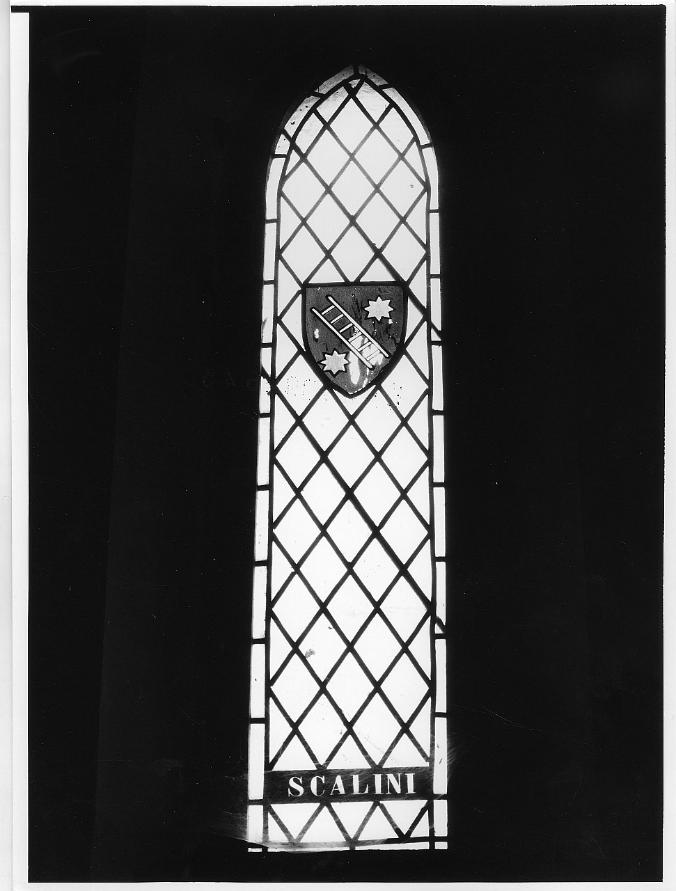 Vetrata a sesto rialzato, formata da una rete metallica a rombi. In alto uno stemma con scudo nero su cui è raffigurata una scala posta di sghembo, affiancata da due stelle ad otto punte. In basso una targhetta.. Araldica: stemma