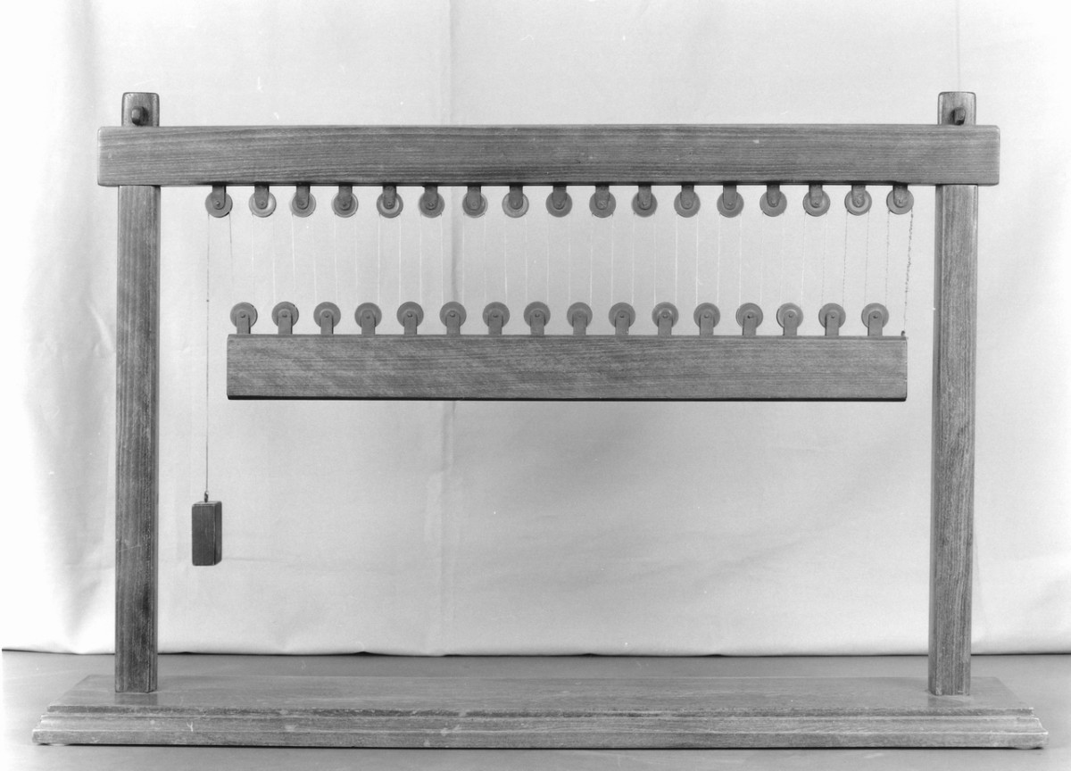 su un basamento in legno è infisso un telaio al quale sono applicate diciassette carrucole; altre sedici carrucole sono applicate ad un'asta in legno; una corda, ad una estremità della quale è applicato un peso passa attraverso le trentatre carrucole permettendo il sollevamento dell'asta in legno. n.p