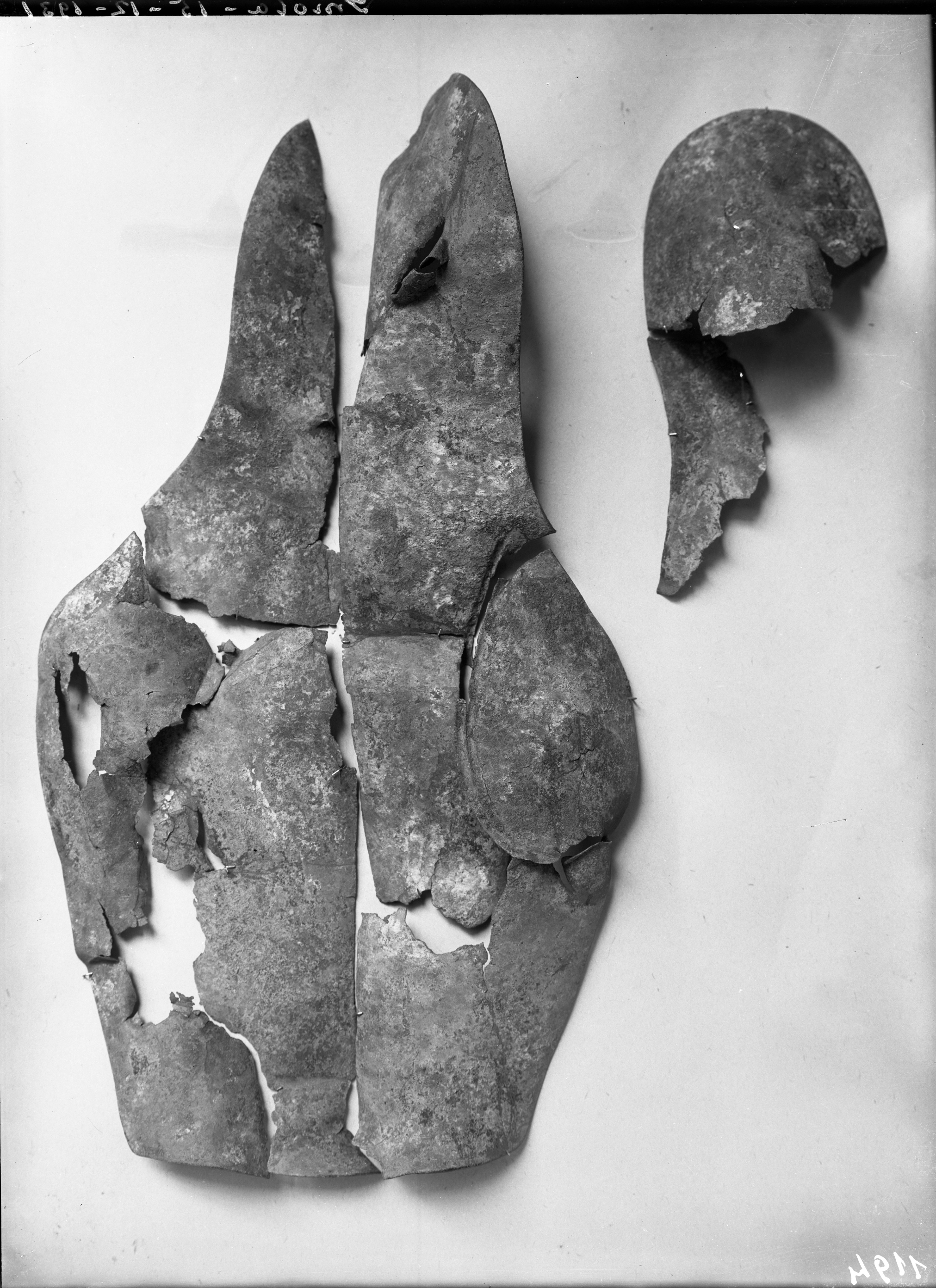 Imola, frazione Linaro, podere Morine di Sotto, rinvenimento 1931, Elmo. Gambali. Calderone