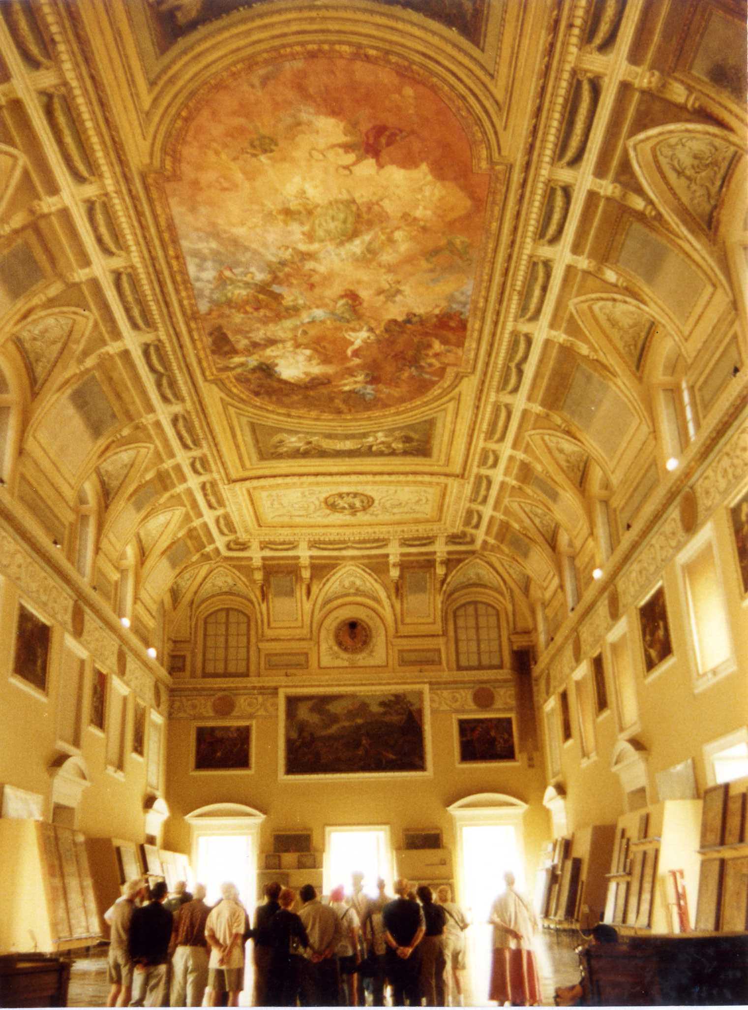 Ampio salone rettangolare, vi si accede dallo scalone e da quattro porte laterali che lo collegano alle due ali del primo piano, altre 4 porte sono degli ambienti ricavati nei contrafforti, in fondo al salone tre balconi affacciano al centro del prospetto principale; nella parte alta vi sono due file di otto finestroni per lato e due finestroni nei lati corti, in parte questi sono stati chiusi; la struttura muraria è in tufo; la copertura è costituita da due ordini di capriate, di altezza diversa, disposte alternamente ed indipendenti le une dalle altre. Il sistema superiore costituisce il vero tetto di copertura, quello inferiore coperto da un manto di battuto, è stato realizzato per meglio proteggere la sottostante volta decorata, agganciata un tempo mediante tiranti lignei, a quattordici travoni di legno correnti per la lunghezza del tetto e poggiati sulle catene delle capriate inferiori