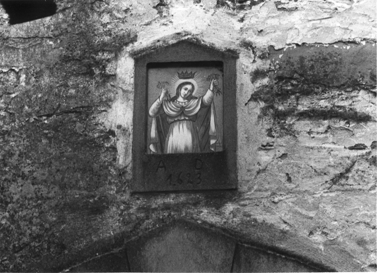 Mostra in pietra con cimasa triangolare; all'interno piastrella policroma.. Soggetti sacri: Madonna