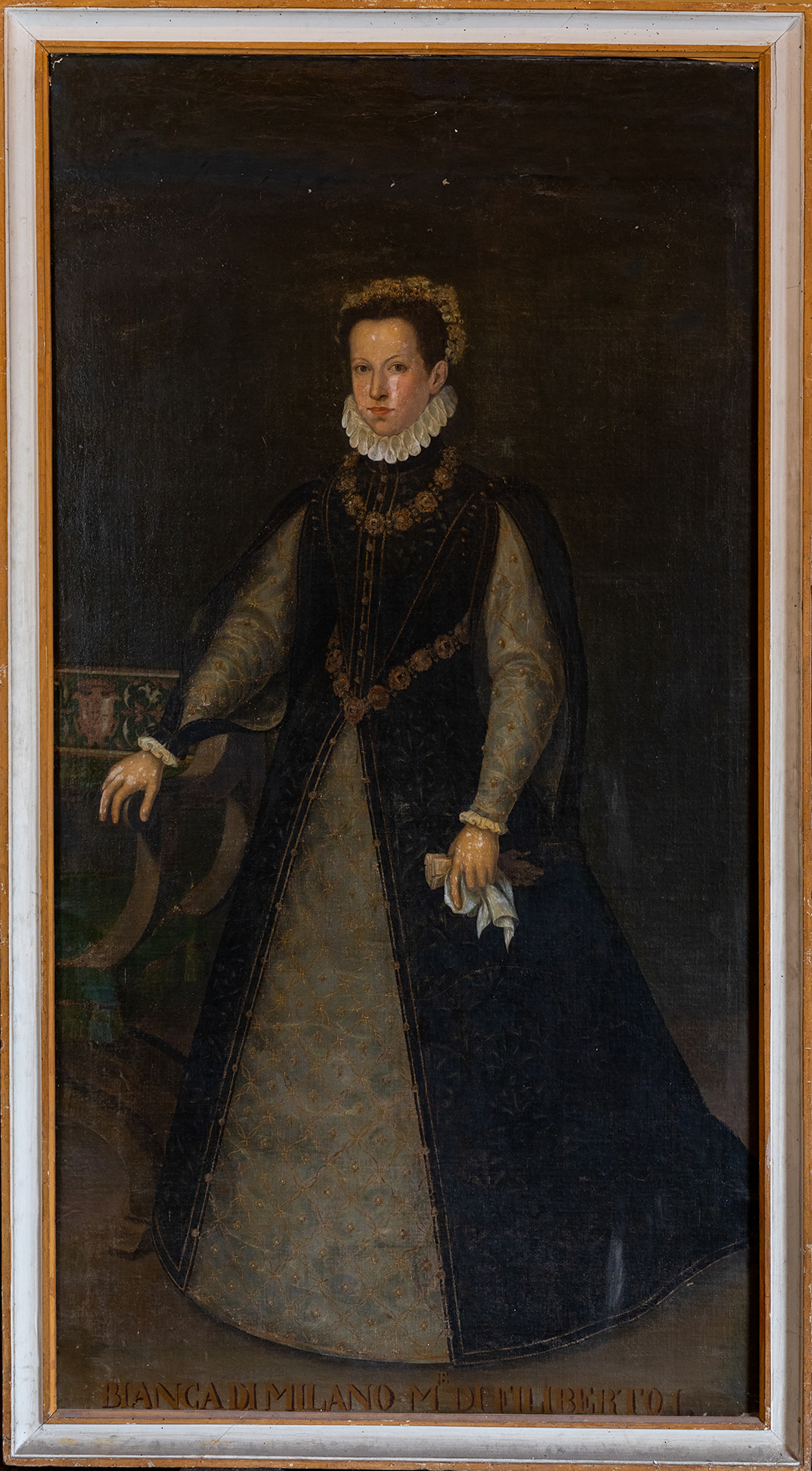 Cornice di legno verniciato in bianco con filettature gialle. PERSONAGGI: Bianca Maria Sforza. ABBIGLIAMENTO: sopravveste; sottoveste; verdugale; cintura; fazzoletto; guanti. OGGETTI: collana; diadema; cuscino. MOBILIA: poltrona