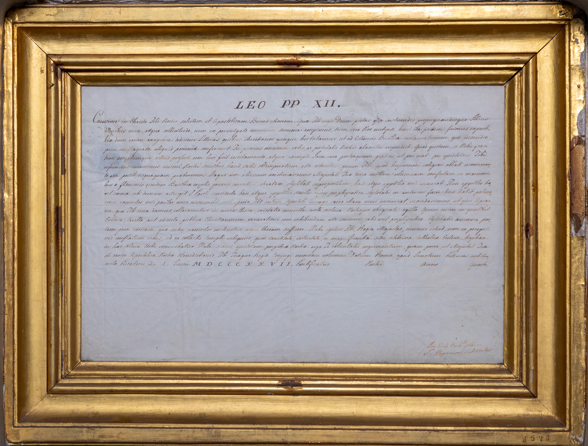 Cornici in legno dorato contenenti enciclica episcopale scritta a mano in latino su carta bianca con intestazione: LEO PP XII.. N.R