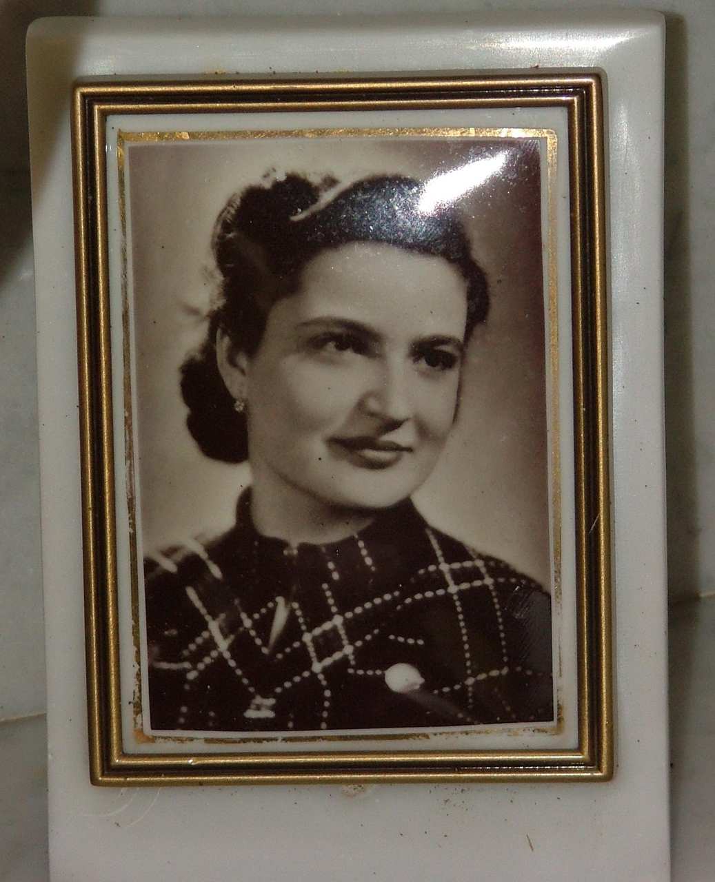 Fotosmaltografia con il ritratto della defunta . La giovane donna ha i capelli raccolti ed indossa un abito decorato a rombi. La fotosmaltografia è montata su una cornice .. Ritratti: Marcella Fioravanti