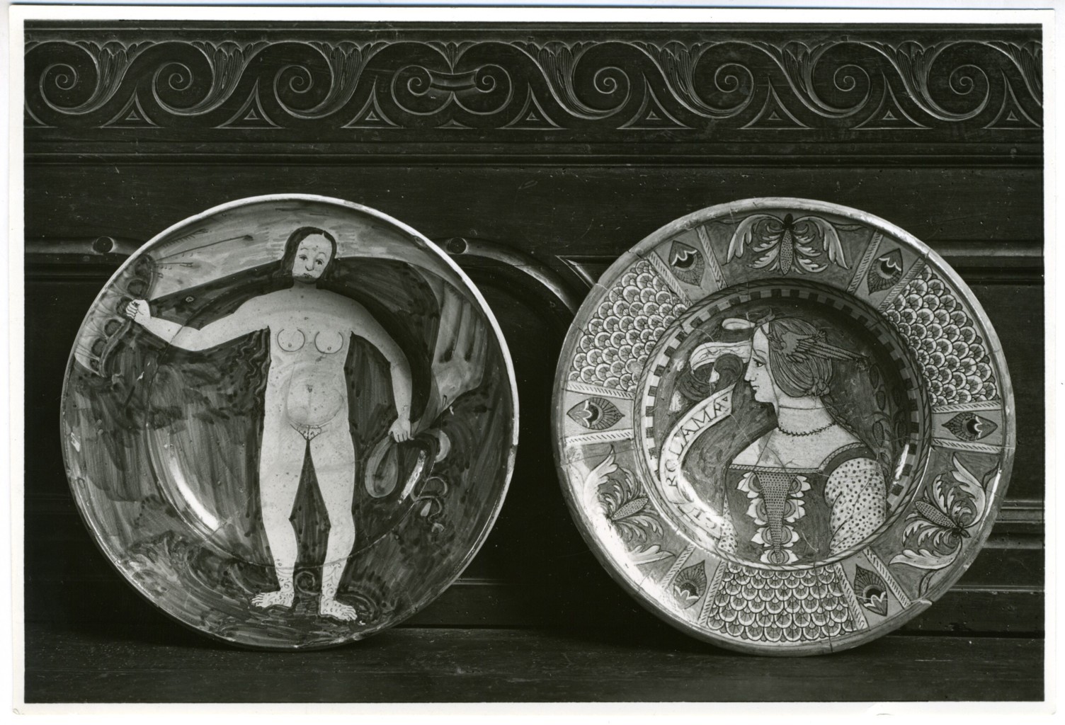 piatti, coppia di piatti di maiolica disposti verticalmente su un mobile di legno intagliato con alzata: quello a destra è decorato sulla tesa da embricature alternate a fiorami e foglie e sul fondo interno con un busto di giovane donna, con capigliatura raccolta in una lunga treccia sulle spalle, stretto corpetto e monili, di fronte a un nastro scritto "GIROLAMA"; quello di sinistra è decorato con una figura femminile nuda rappresentata frontalmente, con lunghi capelli sciolti sulle spalle e i piedi immersi nell'acqua. Il piatto con busto femminile presenta analogie con un piatto del Museo Nazionale del Bargello (FI), n. inv. 1846 della donazione Carrand, prodotto a Deruta nel 1520. Entrambi gli esemplari, facenti parte dell'Eredità Bardini, quello a destra col n. inv. Bd 870, quello a sinistra col n. inv. Bd 872, sono stati trafugati in seguito a furto nel 1976