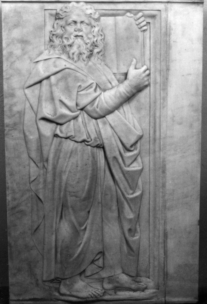 Lastra con cornice modanata.. Soggetti sacri. Personaggi: Mose'. Abbigliamento: abbigliamento all'antica. Attributi: (Mosé) tavole della Legge. Decorazioni: modanature