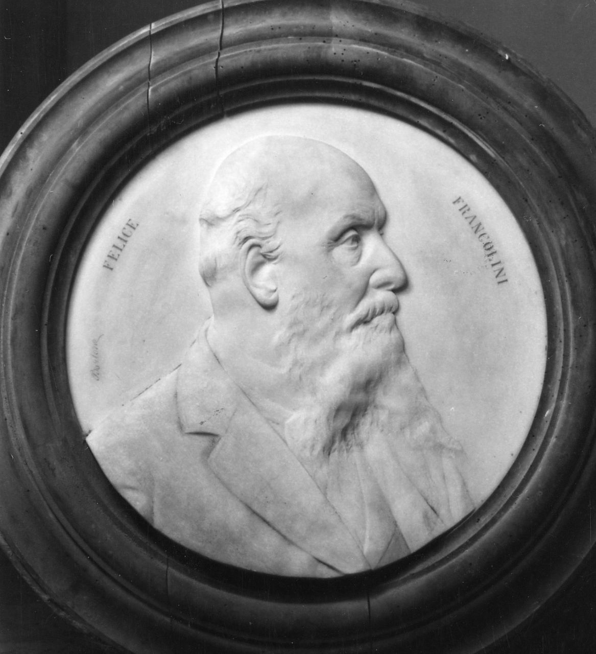 Tondo in marmo bianco a bassorilievo. Cornice di noce coeva.. Ritratti: Felice Francolini. Abbigliamento: giacca; camicia