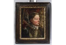 Dipinto raffigurante un uomo in abito cardinalizio, con la sinistra poggiata al petto e la destra con in mano un documento. Vicino un tavolino con un altro documento.. Ritratti: uomo. Armi: elmo; spada. Oggetti: tovaglia; cappello; libro