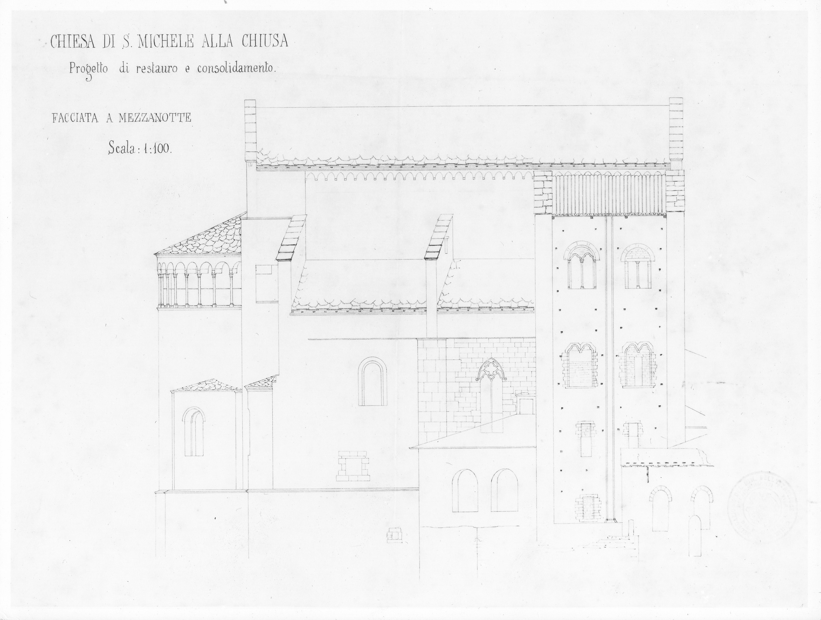 Chiesa di S. Michele alla Chiusa/ Progetto di restauro e consolidamento/ Facciata a mezzanotte, Sacra di San Michele a Sant'Ambrogio di Susa (TO) - Prospetto lato nord (disegno architettonico)