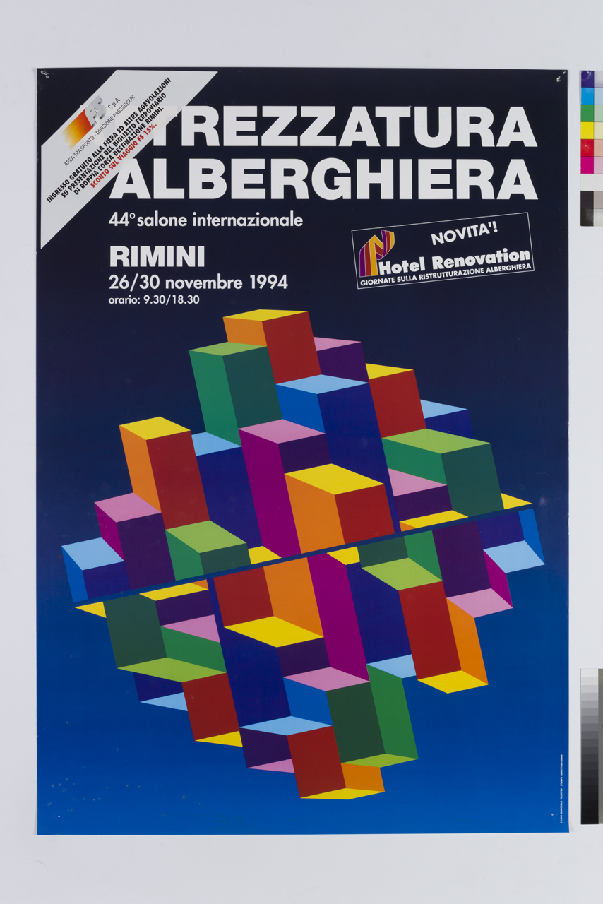 Lettura iconografica: forme geometriche; parallelepipedi; colori. Categoria merceologica/tipo evento: turismo; alberghi; fiere; trasporti; trasporto terrestre; compagnia ferroviaria; riduzioni ferroviarie. Nomi: Attrezzatura Alberghiera 44 Salone Internazionale; Hotel Renovation; FS SpA; Ferrovie dello Stato; Area Trasporto Divisione Passeggeri. Luoghi: Rimini