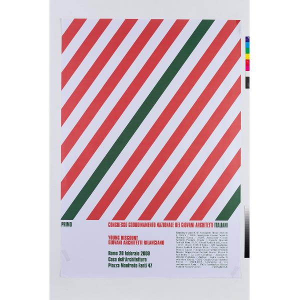 Lettura iconografica: righe. Categoria merceologica/tipo evento: associazioni professionali; congressi. Nomi: Primo Congresso Nazionale dei Giovani Architetti Italiani; Young Discount Giovani Architetti rilanciano; AGAF; Associazione Giovani Architetti di Ferrara; AGAV; Associazione Giovani Architetti Provincia Verona; AGAVE; Associazione Giovani Architetti Provincia Venezia; Consulta Giovanile Architetti Roma; GAC; Giovani Architetti del Canavese; GAT; Giovani Architetti Torino; Associazione Giovani Architetti Provincia Trieste; Giovani Architetti Provincia Cagliari; Gruppo Giovani Architetti Provincia Brescia; Gruppo Giovani Architetti Genova; Pensieri di Architettura; La Città Complessa Associazione Culturale; Morfosis Centro Ricerche di Architettura; GGAF; Gruppo Giovani Architetti Firenze; UMBILICUS Laboratorio di Arti Contemporanee; VAGA; Associazione Giovani Architetti Provincia Vicenza. Luoghi: Roma; Ferrara; Verona; Venezia; Torino; Trieste; Cagliari; Brescia; Genova; Pordenone; Catania; Firenze; Enna; Vicenza