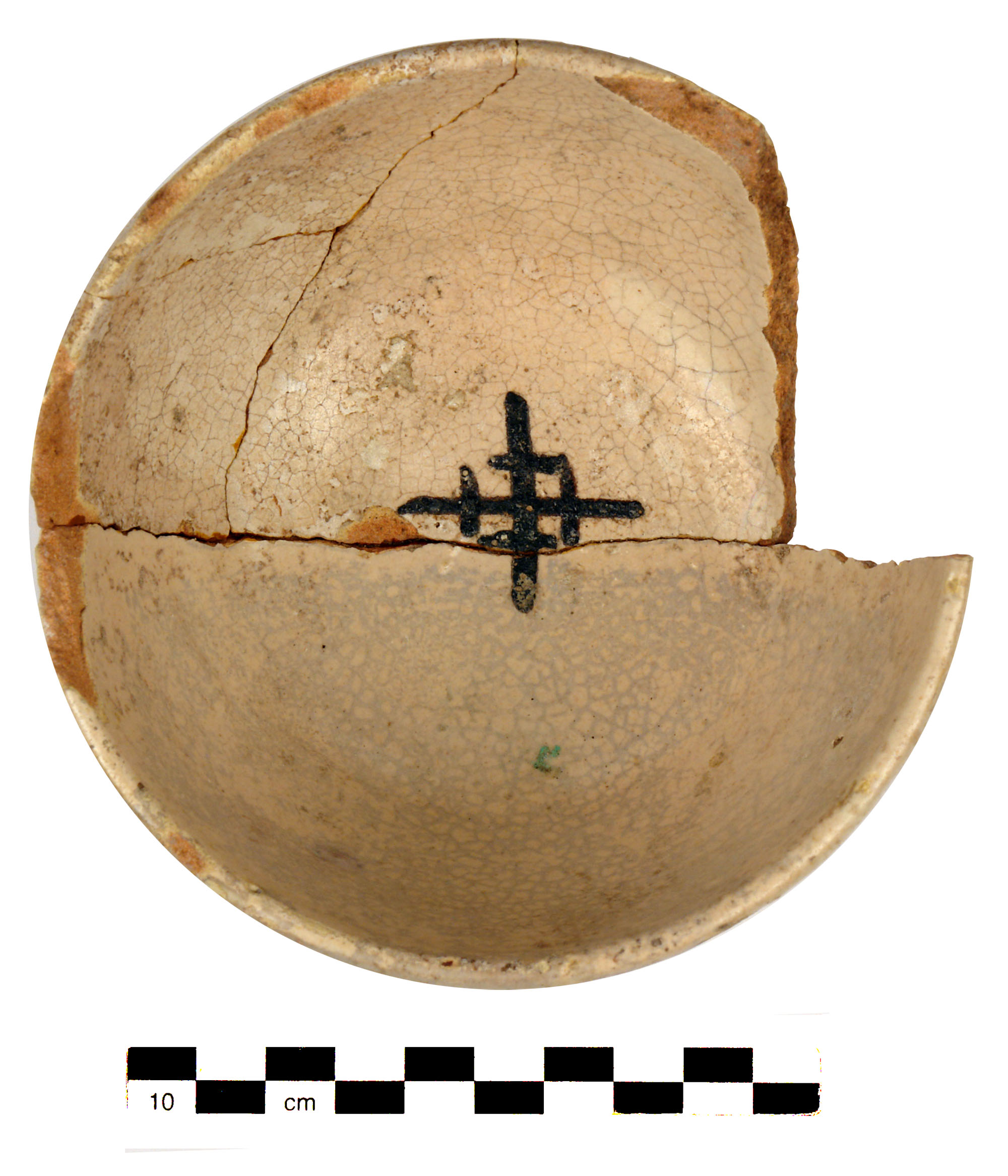 Cavo a calotta con orlo indistinto a profilo arrotondato, fondo esterno appiattito. Interamente rivestita, all’esterno la vetrina è più diluita. Piccola croce ricrociata in bruno al centro del cavo. CC arancio chiaro (M5YR 7/6), duro, compatto, depurato; schiarimento delle superfici; vetrina coprente crema; ossido bruno-manganese.