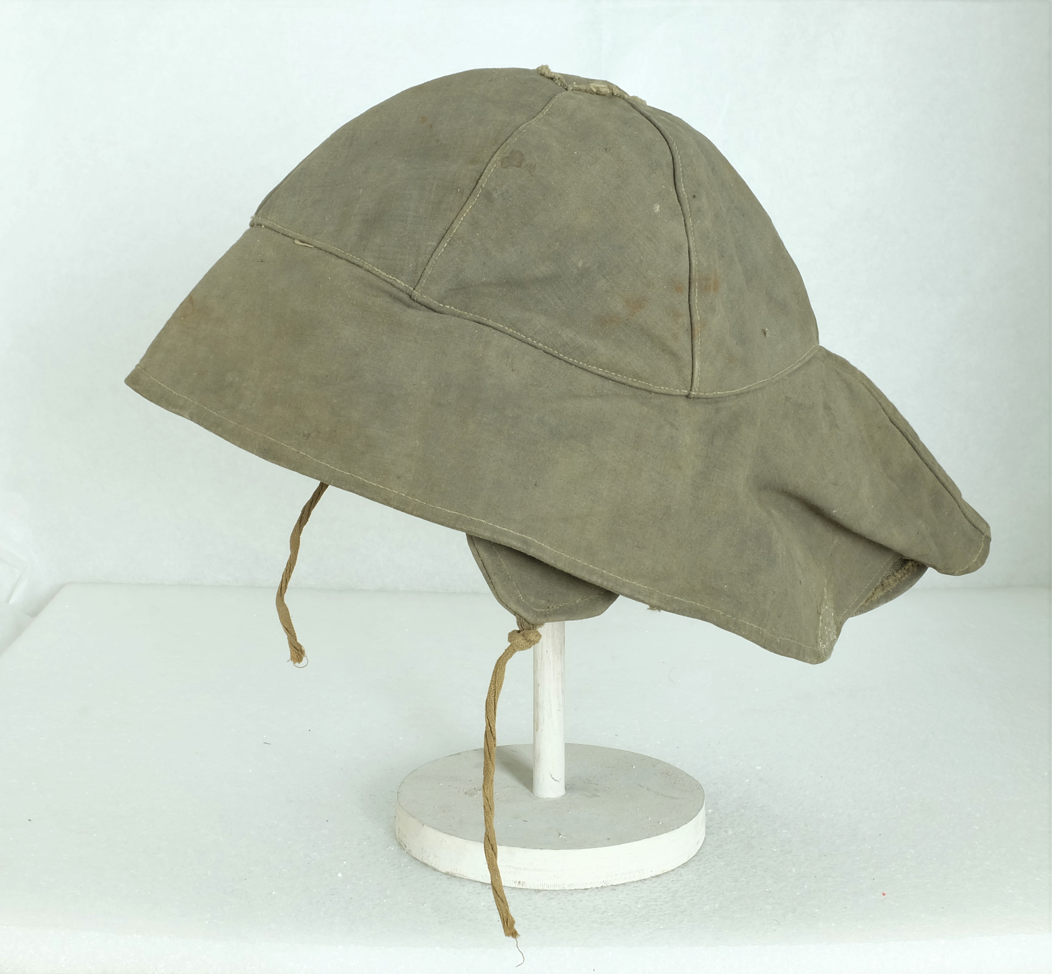 Cappello noto come “Sud-Ovest” facente parte della divisa da pioggia utilizzata dalla Regia Marina fin dal 1882. Copricapo impermeabile in quanto realizzato in tela cerata grigio-verde. È formato da un cupolino emisferico, da una tesa anteriore, una grande tesa posteriore e da un paraorecchie (uno è mancante) ai quali è fissata una fettuccia che funge da soggolo. All’interno la parte del cupolino è foderato di cotone