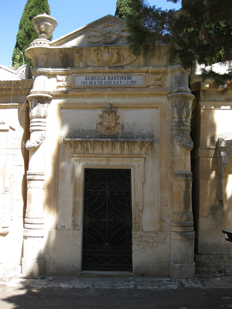 pavimenti: mattonelle ceramiche policrome a motivi floreali, intero bene; elementi decorativi: colonne; cancello; timpano (ornate da festoni lapidei; con capitello a calice rivestito da foglie di loto; a motivi floreali; con teschio con ossa incrociate; triangolare; una ghirlanda di alloro con falce e fiaccola capovolta; fiancheggiato negli angoli da una coppia di urne lapidee, pietra calcarea locale; ferro battuto; ghisa; pietra calcarea locale), prospetto principale; prospetto principale; prospetto principale, esterna; esterna; esterna; isrizioni, lapidi, stemmi: lapide (incisa/o, marmo), in sommità