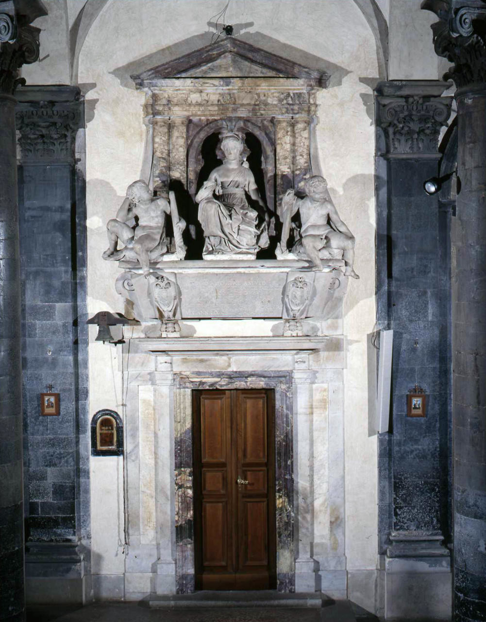 Monumento funebre composto da un piatto sarcofago sorretto da due grosse zampe di leone, in corrispondenza delle quali si tovano due scudi con arme Altoviti, racchiusi da una cornice a cartocci; tra i due scudi vi è l' iscrizione lapidaria a lettere capitali; sul sarcofago, ai cui lati sono scolpite due grosse volute, poggia un' edicola composta da due lesene per parte, reggenti un' architrave sormontata da un timpano con cornice aggettante, il tutto in marmi mischi. Al centro, all' interno di una nicchia, è collocata la statua raffigurante la "Fede", affiancata da due fanciulli scolpiti a tutto tondo e reggenti due faci accese rivolte verso il basso.. Virtù teologali: Fede. Figure: fanciuli. Attributi: (Fede) calice. Attributi: (fanciulli) faci. Araldica