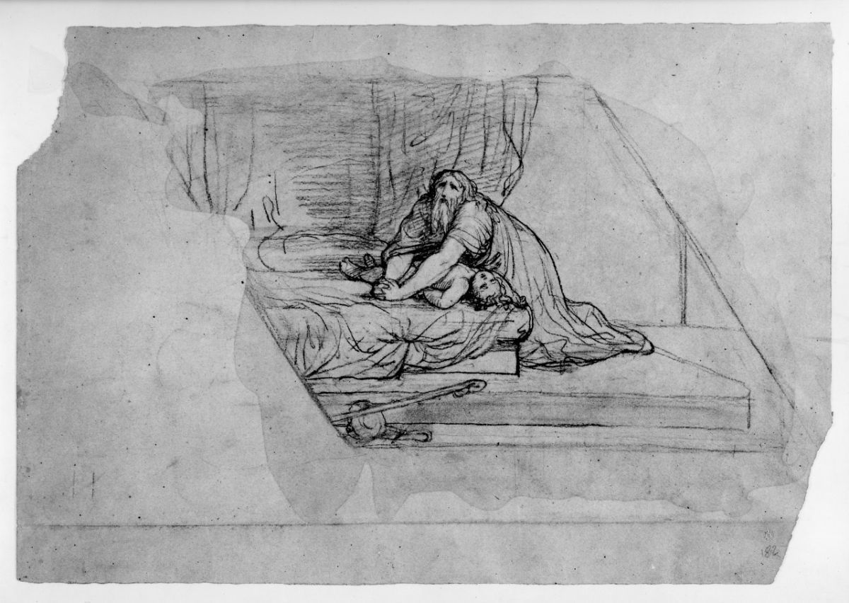 Uno studio riquadrato di composizione con un vecchio inginocchiato sul corpo inerte di un fanciullo.. Personaggi: Elia; figlio della vedova