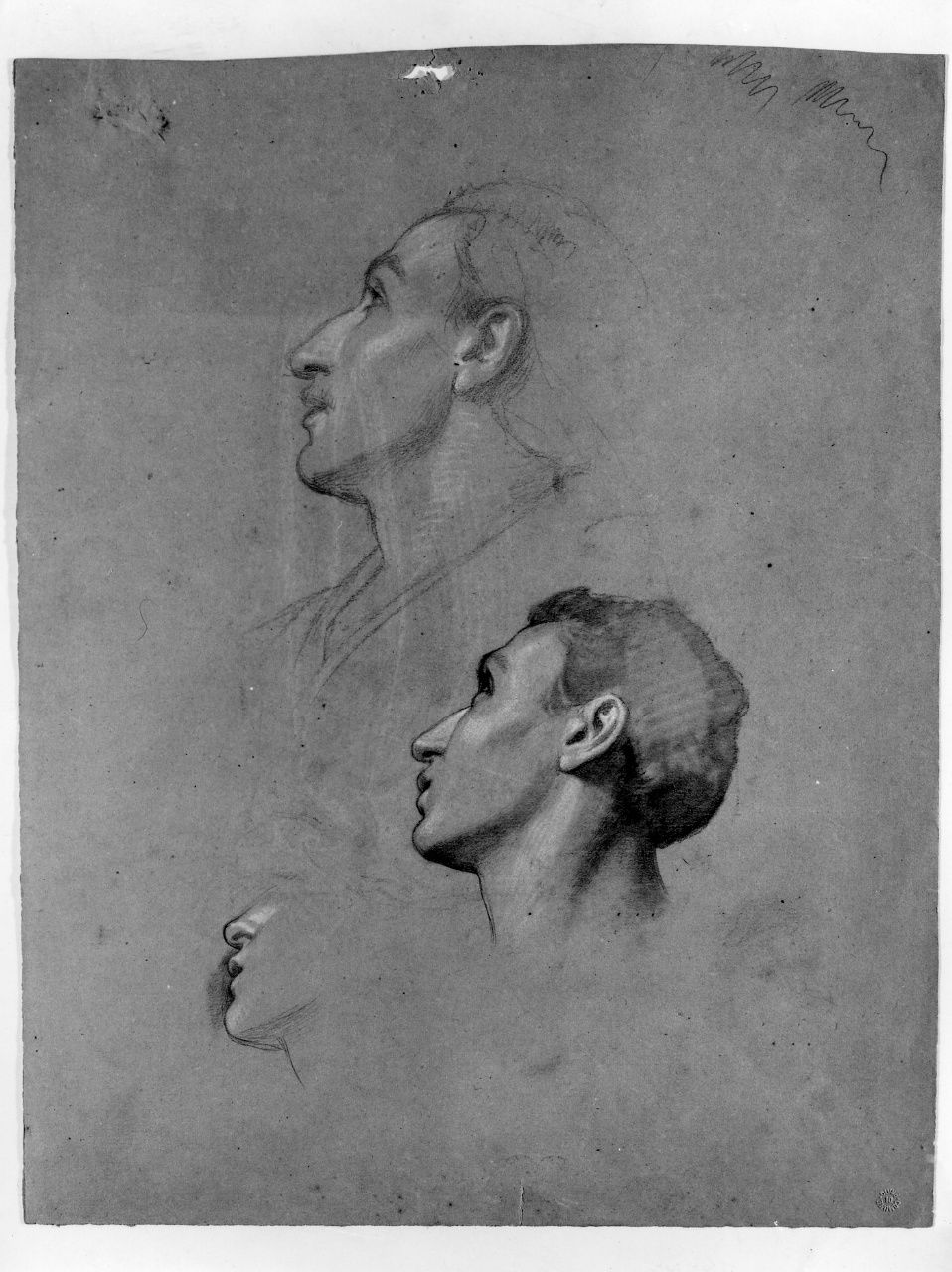 Tre studi di testa virile di profilo, lumeggiati a biacca (r.). Tecnica: Matita nera, sfumino e biacca su carta grezza, prove di grafite (r.); matita nera e prove di grafite (v.).