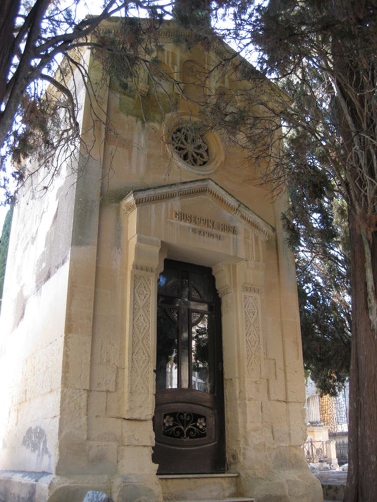 elementi decorativi: rosone; paraste; cancello; timpano (con cornice strombata; con traforo a raggiera; con fregi a losanghe con fogliami; a motivi floreali; con motivo della croce; triangolare; su cornice a dentelli e archetti pensili, pietra calcarea locale; pietra calcarea locale; ferro battuto; ghisa; vetro; pietra calcarea locale), prospetto principale; prospetto principale; prospetto principale; prospetto principale, in sommità; portale; esterna; esterna; isrizioni, lapidi, stemmi: iscrizione (scolpita/o, pietra calcarea locale), portale