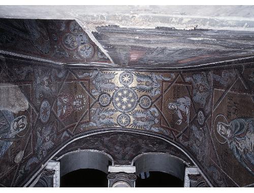 Decorazioni: motivi geometrici, racemi vegetali.. Soggetti sacri. Personaggi: Sant'Agnese; Santa Lucia; Santa Caterina d'Alessandria; Santa Margherita. Attributi: (Sant'Agnese) agnello. Attributi: (Santa Lucia) occhi sul piatto. Attributi: (Santa Caterina d'Alessandria) palma