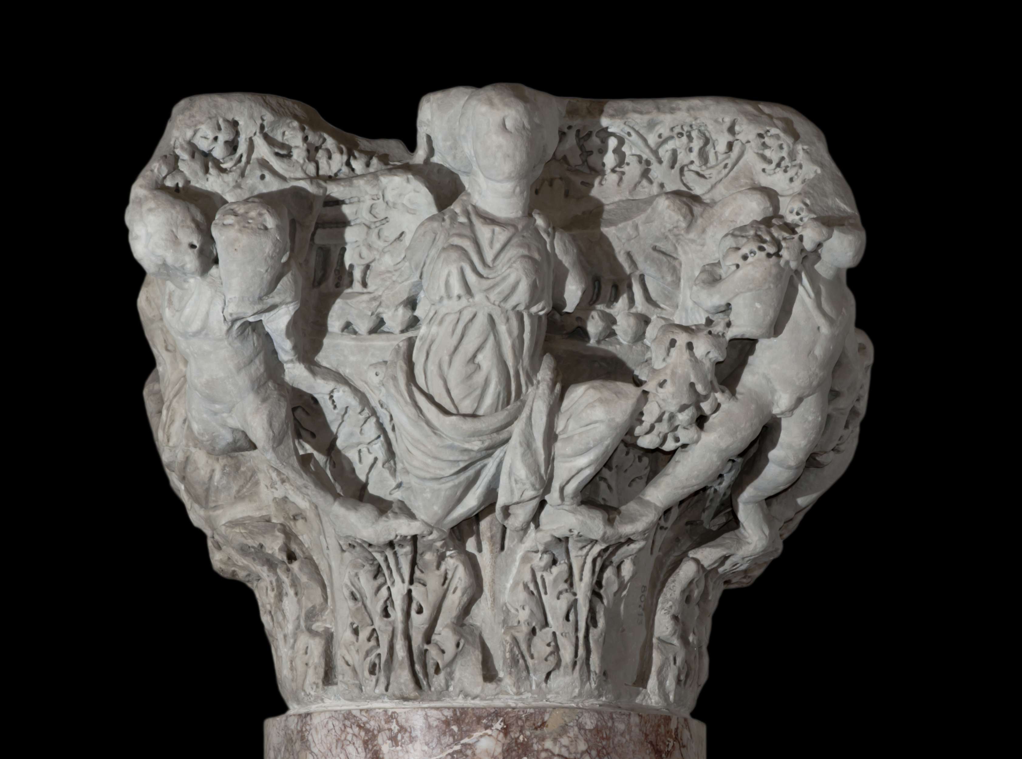 Il capitello presenta una prima corona di foglie d'acanto, a cinque lobi scanalati, dagli spazi intermedi delle quali partono le foglie di una seconda corona delle cui foglie centrali si vede solo la parte inferiore, essendo la parte superiore coperta da una figura femminile alata, vista di prospetto, nella posizione della cosiddetta "corsa in ginocchio". Queste figure presentano un ginocchio, che è il destro o il sinistro a seconda del lato considerato, poggiato sulla punta di una foglia della prima corona, ed il piede dell'altra gamba anch'esso poggiato sulla punta di una foglia contigua alla precedente. La figura indossa un chitone manicato, con alta cintura, ed un mantello avvolto intorno ai fianchi un lembo del quale è poggiato sulla coscia della gamba piegata. Nella mano, lateralmente tesa, tiene un enorme grappolo con foglie. Le ali sono ampiamente distese. Agli angoli ci sono quattro figure di eroti, stanti, con le gambe divaricate che poggiano su due foglie contigue. Indossano solo la clamide che portano gettata dietro le spalle. Gli eroti tengono, alternativamente nella mano destra e nella sinistra, un cesto colmo. Ai lati delle vittorie ci sono dei caulicoli con fiore. Il kalathos ha il bordo segnato da un listello liscio, a sezione convessa, sul lato anteriore è decorato con motivo a perle e astragali sugli altri lati. Sopra di questo si intravvede su alcuni lati un motivo ad ovuli e freccette che viene in parte coperto dalle ali delle Vittorie. L'abaco è decorato da tralci vegetali che partono da rosette centrali. Il fiore d'abaco è sostituito dalle teste delle figure femminili alate. Il Matz ( F. MATZ - F. von DUHN, Antike Bildwerke in Rom, Leipzig 1881-82, 3, n. 3445) ha proposto che il capitello provenga dalle Terme di Caracalla dove sono stati rinvenuti altri capitelli di questo tipo. Ad un'attente analisi delle qualità stilistiche di questi si possono notare delle differenze tali da non poter attribuire al capitello qui preso in considerazione una datazione corrispondente. Vediamo infatti, per esempio, la totale scomparsa delle volute nel capitello Mattei; tale elemento, invece, si trova ancora negli esemplari delle Terme di Caracalla come anche si trova nel capitello che sta nel Cortile della Pigna ai Musei Vaticani (W. AMELUNG, Die Sculpturen des Vaticanischen Museums, I, Berlin 1903, p. 904, tav. 119) che il Mingazzini (P. ARNDT - W. AMELUNG, Photographische Einzelaufnahmen antiker Sculpturen, München 1929 ,n. 3249) assegna all'età di Gallieno e che il Petersen (W. AMELUNG, op. cit., p. 906) data il capitello Mattei dopo per il quale sia il Mingazzini sia il Mercklin (E. von. MERCKLIN, Antike Figuralkapitelle, Berlin 1972, n. 392) sono daccordo per una datazione posteriore cioè per i primi decenni del IV sec. a.C. Anche il Kaehler (H. KAEHLER, Dekorative Arbeiten aus der Werkstatt des Konstantinsbogens, Jd I 51, 1936, p. 201, nota 1) afferma che questo capitello, insieme a quello che si trova in S. Maria in Cosmedin, sono della stessa officina dell'Arco di Costantino. Un ulteriore confronto si può fare con un capitello di S. Maria della Rotonda ad Albano Laziale (E. von MERCKLIN, op. cit., n. 399) datato all'inizio del IV sec. d.C.