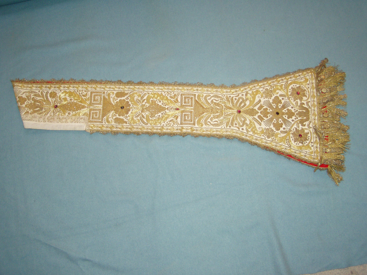 La stola presenta un doppio decoro con greche affrontate a formare le anse di vasi, da cui si dipartono elementi fitomorfi e floreali. Un fiocco ricamato svolge le funzioni di raccordo con la parte svasata della stola dove, tra girali desinenti in fiorami, è la croce greca raggiata con terminazioni a polilobo. Al centro dei fiorami, delle croci e dei fiocchi paste vitree emulanti pietre preziose. Bordura a rombi alternati a motivi a stella.. Motivi decorativi fitomorfi e floreali, vasi biansati, motivo nastriforme a fiocco, croci greche, in filato d‘oro a punto posato, bordura perimetrale in filato d‘oro a rombi, gallone a fuselli in filato d‘oro, frangia in filato d‘oro ritorto, canutiglia, fiocchi in lamina dorata, paste vitree