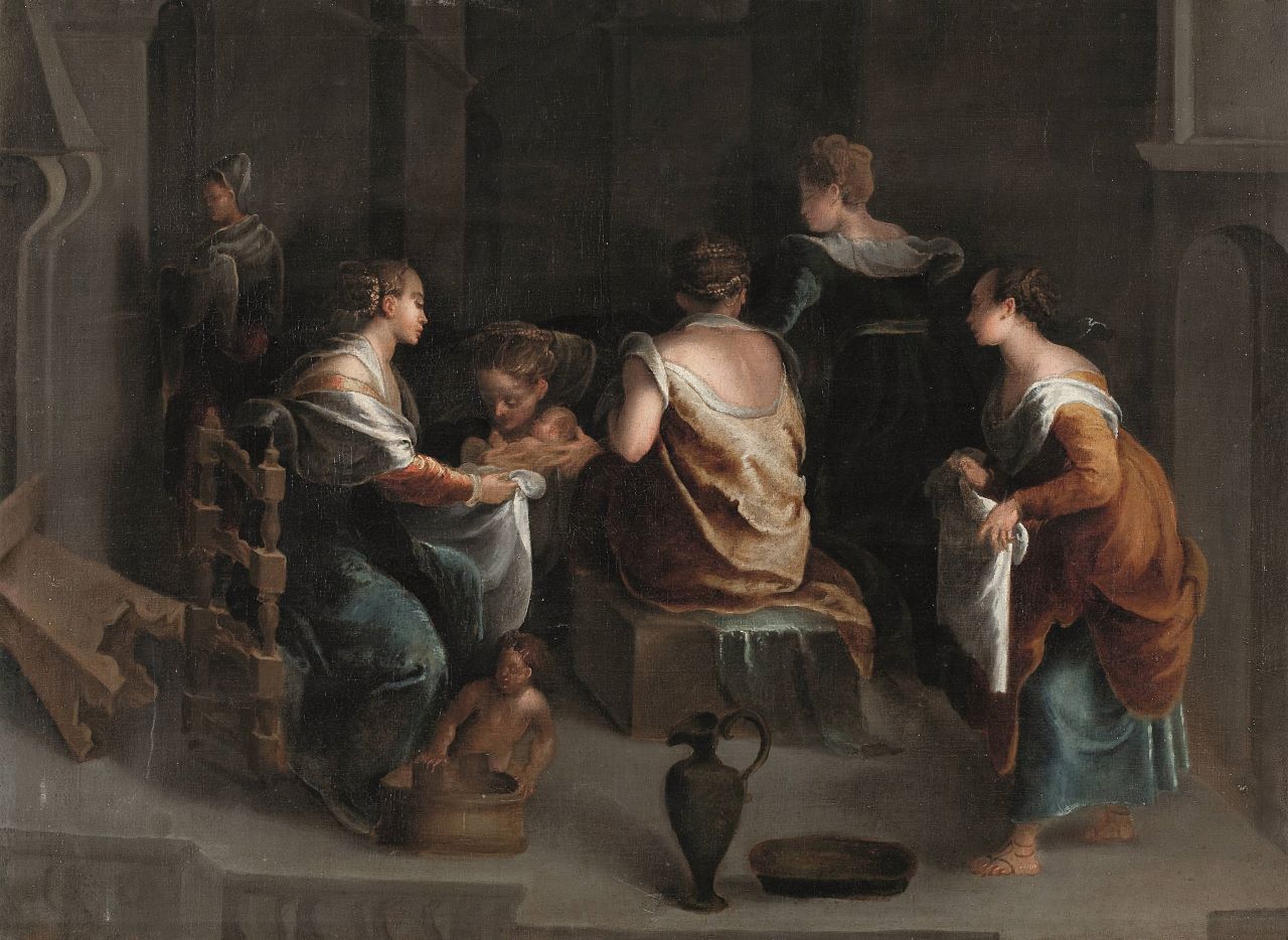 Tela di medie dimensioni, nella penombra di un interno si vedono a sinistra un camino, uno sgabello rovesciato, una donna in piedi e una porta dalla quale è entrata una fantesca con un panno; su una sedia da balia una donna prende in braccio la neonata, ai suoi piedi un bambino ripone il mastello su cui è stata lavata la bambina. Al centro una sesta donna in vestaglia con la schiena scoperta. . SOGGETTI SACRI: NATIVITA' DELLA VERGINE