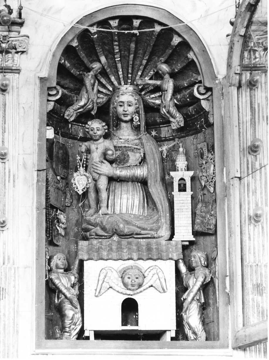 Il gruppo scultoreo rappresenta due angioletti, vestiti con tunica dorata, che sorreggono la Santa Casa di Loreto con gesto simmetrico. Sopra questa e' rappresentata frontalmente, per tre quarti di altezza, la Madonna incoronata ed in vesti d'oro, che tiene in piedi alla sua destra il Bambino ignudo con in mano la sfera. Piu' in alto, due angeli indicano il sacro gruppo.. Personaggi: Madonna di Loreto; Bambino. Figure: angeli. Attributi: (Madonna di Loreto) casa