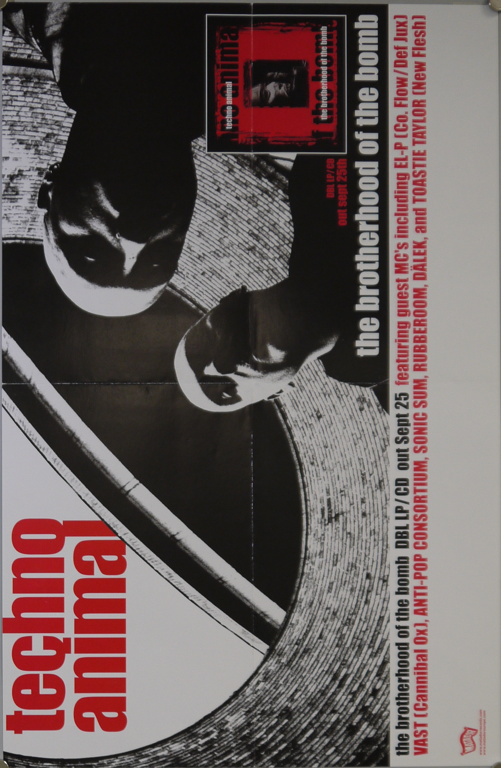 Lettura iconografica: Ritratto fotografico dei Techno Animal all'interno di un'architettura modernista, copertina dell'album "The brotherhood of the bomb". Categoria merceologica: evento culturale, produzione musicale. Nomi: Techno Animal; MC's; El-p; Vast; Anti-Pop Consortium; Sonic Sum; Rubberoom; Dalek; Toastie Taylor; Matador. Luoghi: