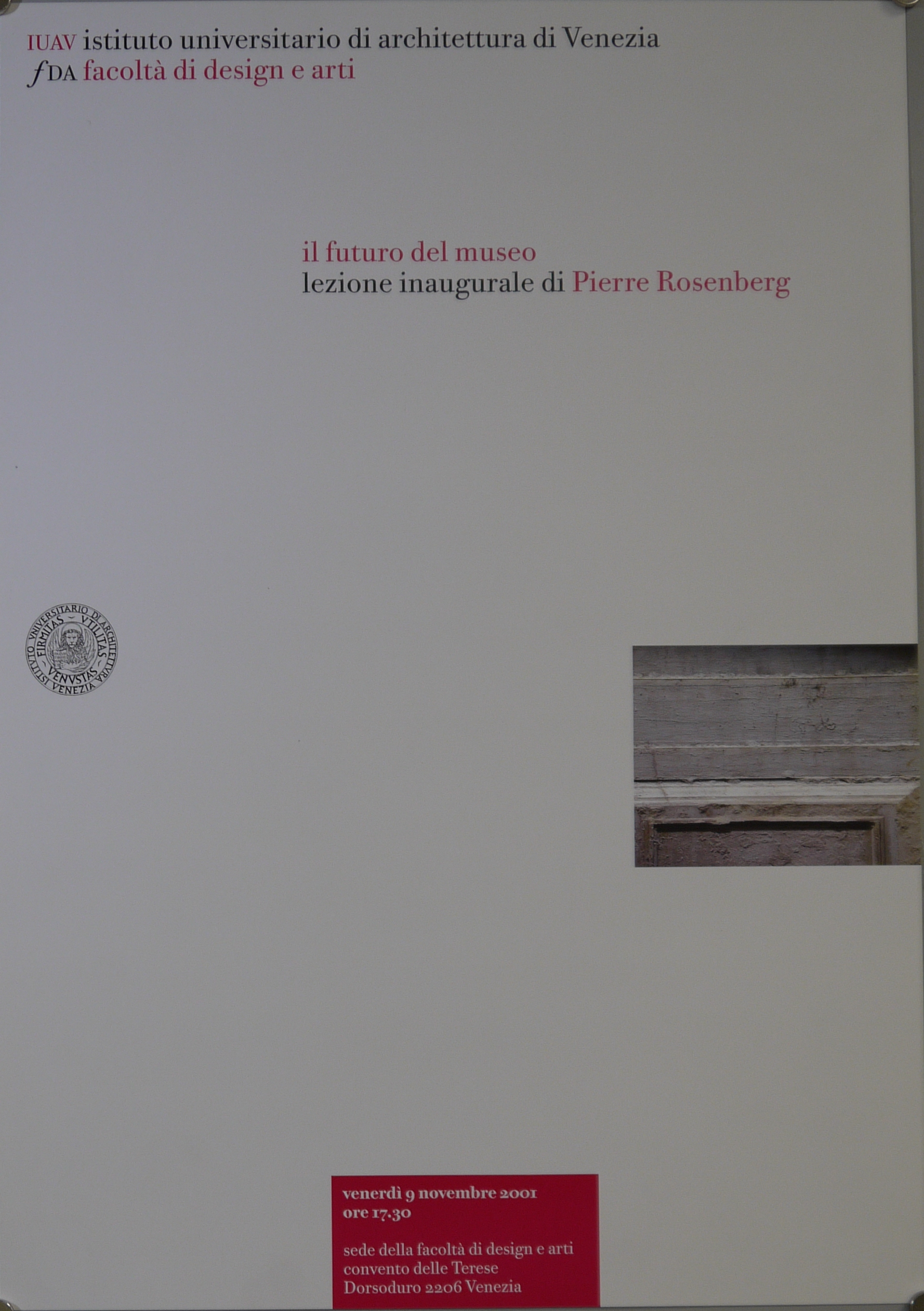 Lettura iconografica: dettaglio ravvicinato di cornice. Categoria merceologica: ricerca universitaria, formazione universitaria, conferenza. Nomi: IUAV Istituto universitario di architettura di Venezia; fDA facoltà di design e arti; Pierre Rosenberg. Luoghi: Convento delle Terese; Venezia