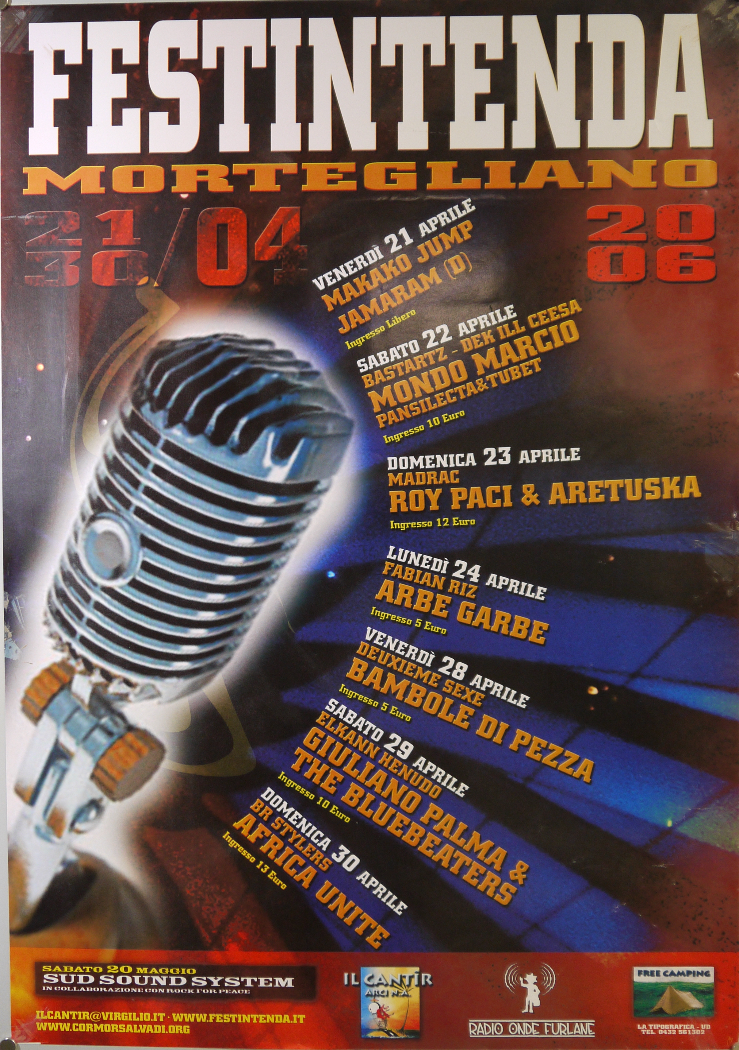 Lettura iconografica: Microfono raiofonico, strisce colorate su sfondo a griglia geometrica. Categoria merceologica: evento culturale, rassegna musicale. Luoghi: Mortegliano