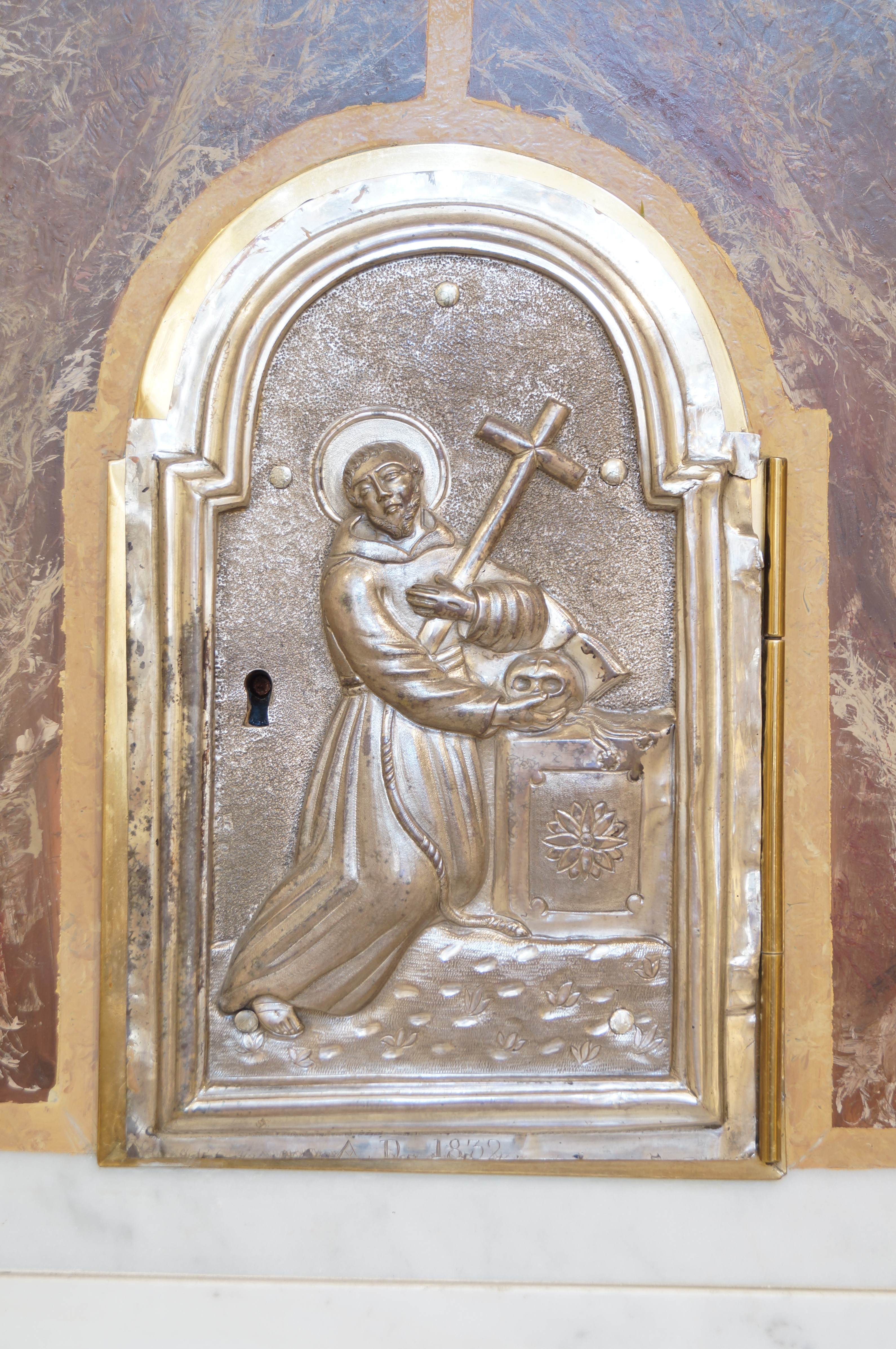 cassa in ottone dorato con lamina esterna in argento. Personaggi: Francesco d'Assisi. Attributi: (Francesco d'Assisi) teschio; croce