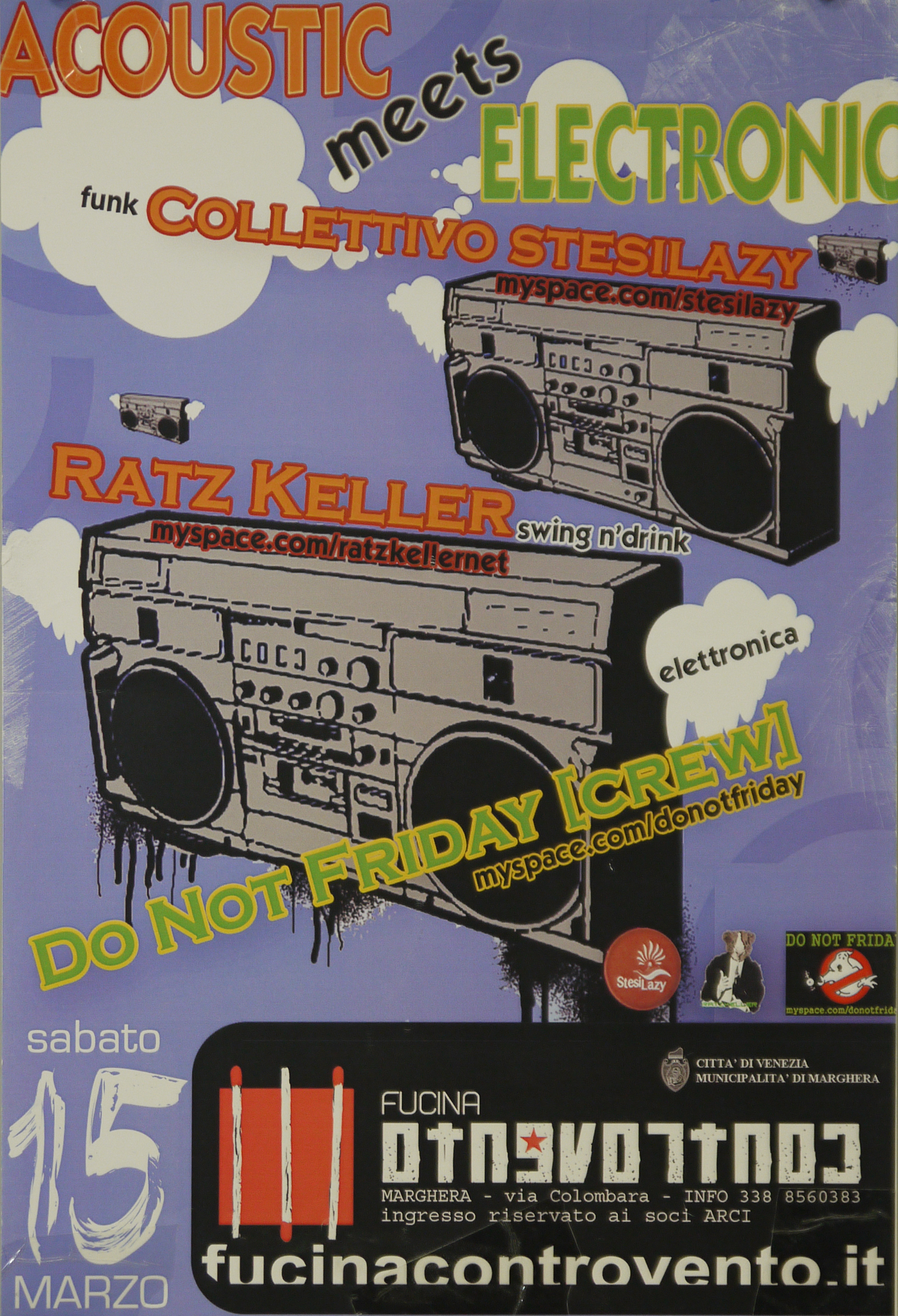 Lettura iconografica: nuvole; apparecchi per la riproduzione della musica; stereo; lettore musicassette; radio; registratore. Categoria merceologica/tipo evento: tempo libero; night club; discoteca; musica acustica; musica elettronica; gruppi musicali; amministrazione pubblica; amministrazione comunale; associazione ricreativa culturale italiana. Nomi: Acoustic meet electronic; Collettivo Stesilazy; Ratz Keller; Fucina Controvento; ARCI; Do Not Friday; Città di Venezia; Municipalità di Marghera. Luoghi: Marghera; Venezia; Veneto