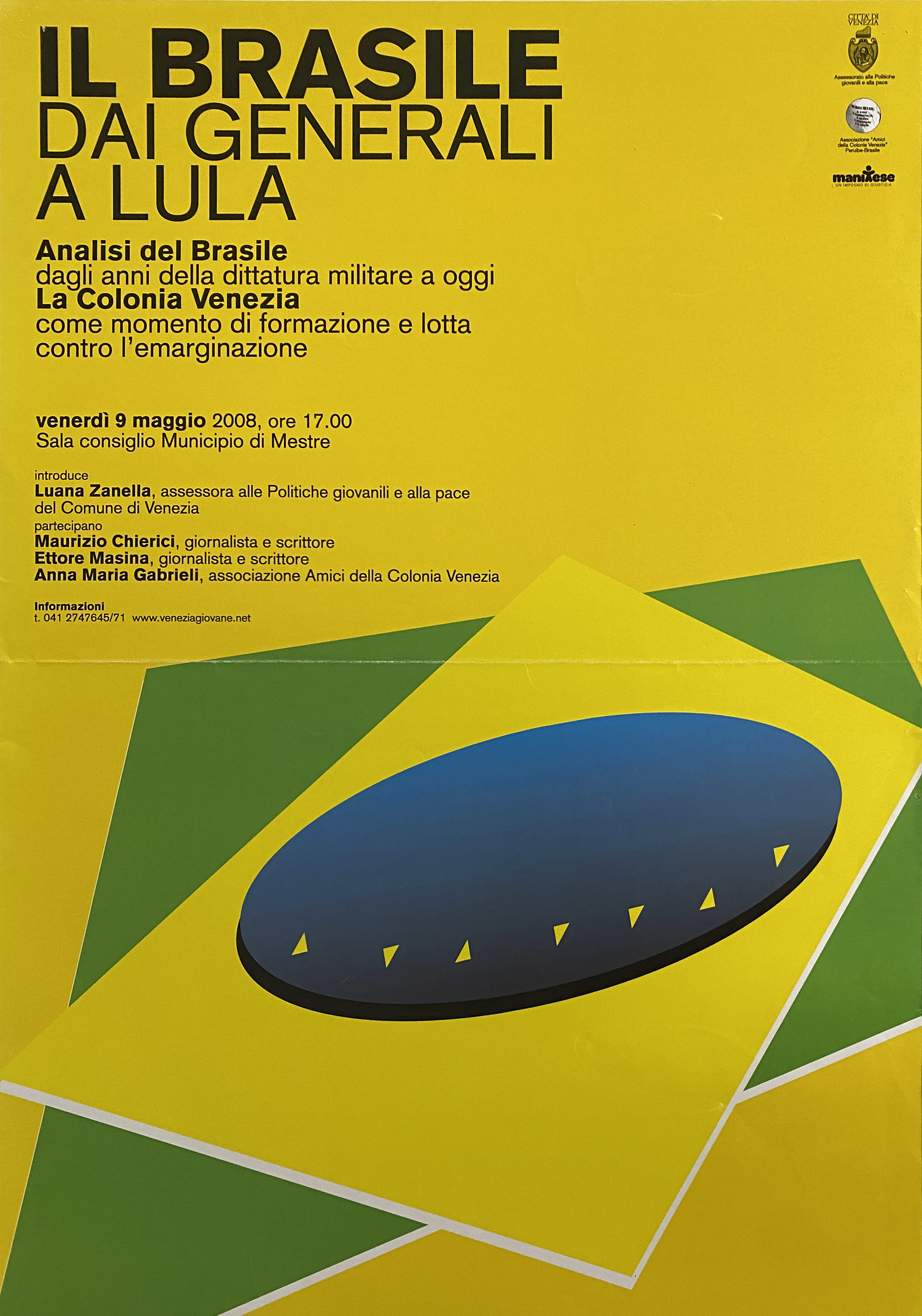 Lettura iconografica: simboli dello Stato; bandiera. Categoria merceologica/tipo evento: manifestazioni culturali; conferenze; studi storici; scienze politiche; giornalismo; scrittura; giornalisti; scrittori; amministrazione pubblica; enti locali; amministrazione comunale; associazioni culturali; istruzione; istituzioni culturali; organizzazione non governativa e non lucrativa di utilità sociale. Nomi: Brasile; Lula; Luiz Inácio da Silva; dittatura militare; Colonia Venezia; Luana Zanella; Assessorato alle Politiche giovanili e alla pace; Maurizio Chierici; Ettore Masina; Anna Maria Gabrieli; Città di Venezia; Associazione Amici della Colonia di Venezia; Peruíbe; Manitese Un impegno di giustizia. Luoghi: Mestre; Venezia; Veneto