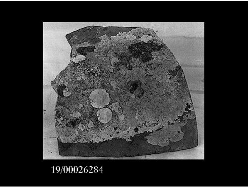 Grosso frammento di pancia di anfora a pareti piuttosto sottili, striature di tornio sulla superficie esterna. Macchie di pece. Superficie interna rivestita da una patina arancione.
