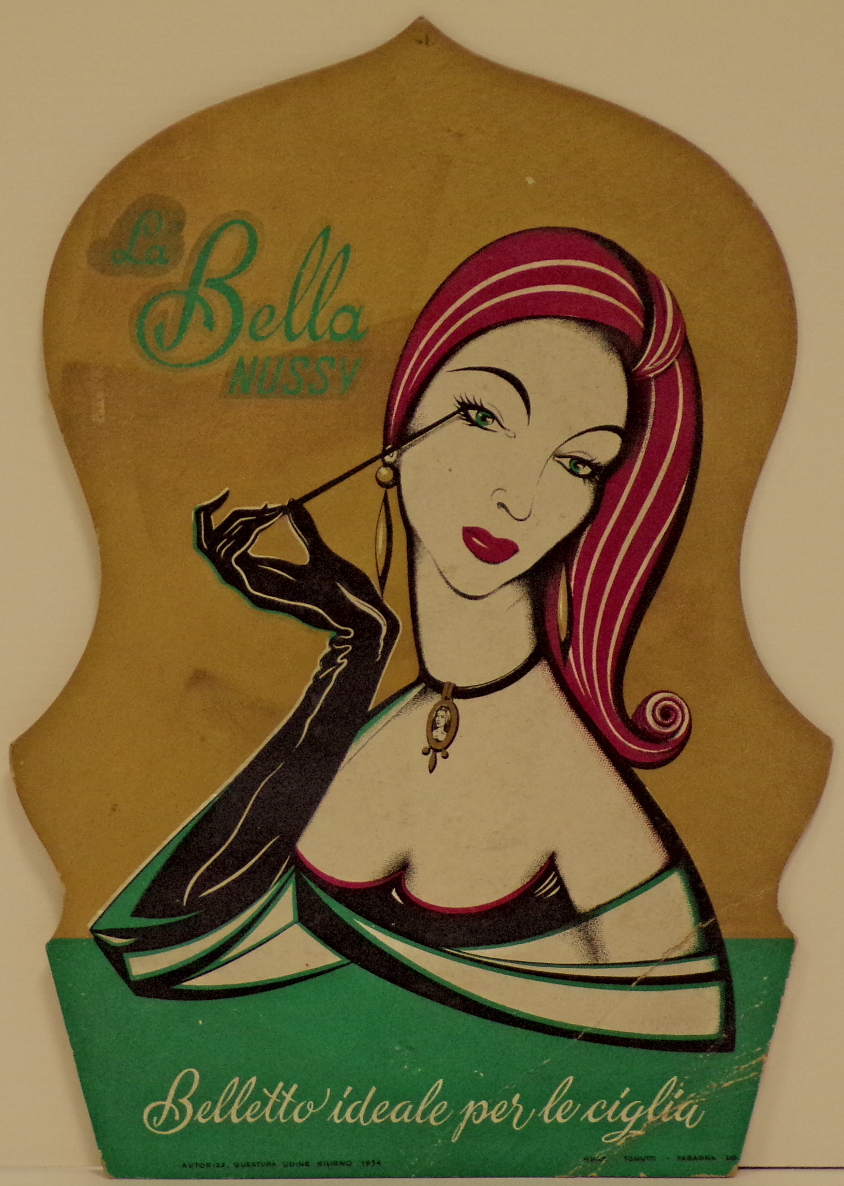 Cartello da vetrina. Lettura iconografica: figura femminile; mezzobusto; donna "di classe"; orecchino pendente; collier con pendente; miniatura; guanto nero; mascara. Categoria merceologica/tipo evento: industria cosmetica; produzione mascara. Nomi: La Bella Nussy; Questura di Udine; Grafiche Tonutti. Luoghi: Fagagna; Udine