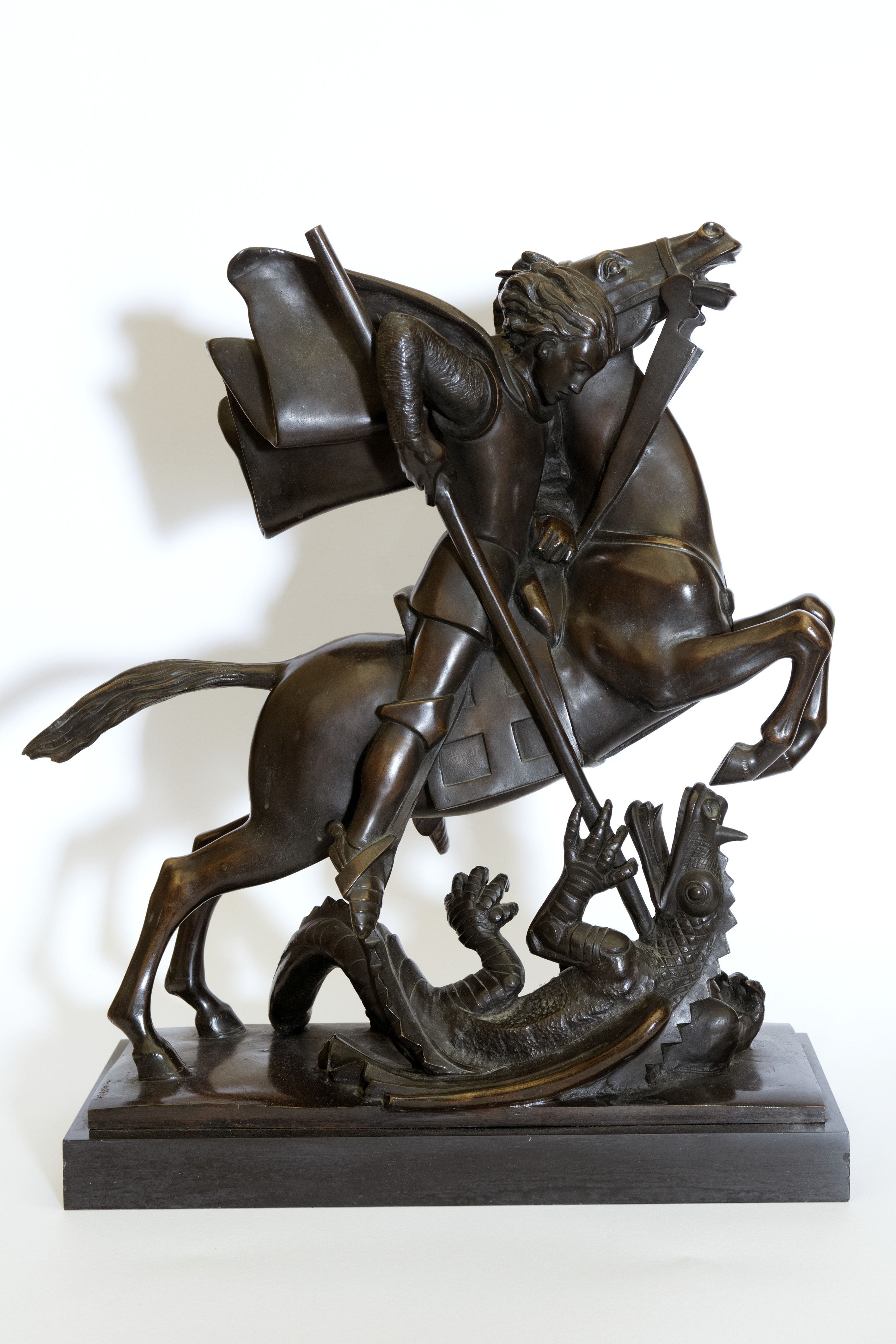 bronzetto con basamento rettangolare bronzeo poggiato a sua volta su base in legno verniciato color scuro. Le zampe posteriori del cavallo di San Giorgio sono in appoggio, così come il terminale della spada, che trafigge il drago, riverso a terra e con l'addome esposto. Il cavallo si inalbera infatti sulle zampe anteriori, protese in alto come il museo e il mantello sollevato del Santo cavaliere.. Personaggi: San Giorgio. Animali: drago; cavallo. Attributi (San Giorgio) spada; armatura; mantello