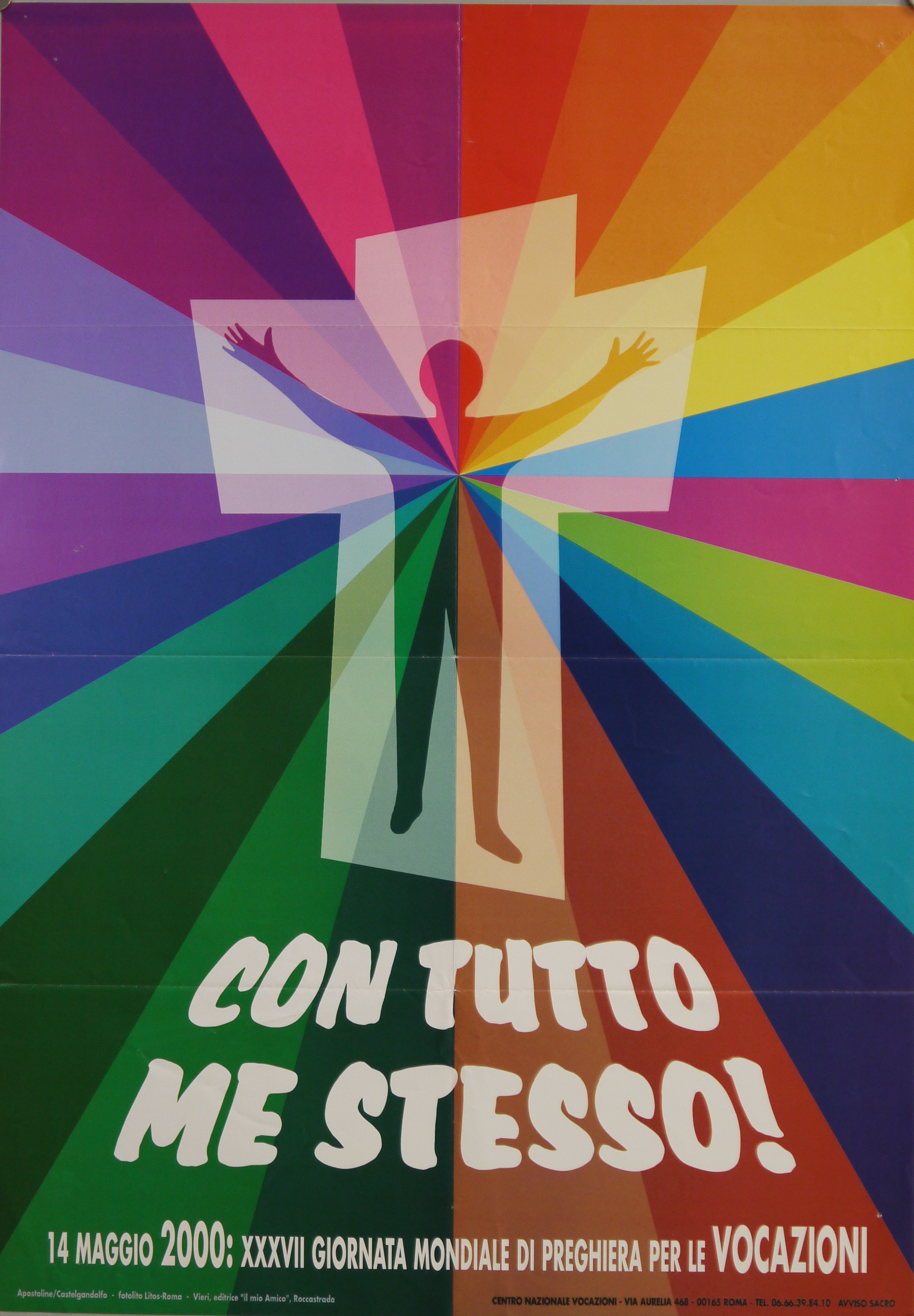 Lettura iconografica: figura umana stilizzata; croce; strisce colorate a raggiera. Categoria merceologica/tipo evento: evento sociale; evento religioso; momento di preghiera. Nomi: Apostoline; Fotolito Litos; Vieri; Editrice "Il mio Amico"; Centro Nazionale Vocazioni. Luoghi: Castelgandolfo; Roccastrada; Roma