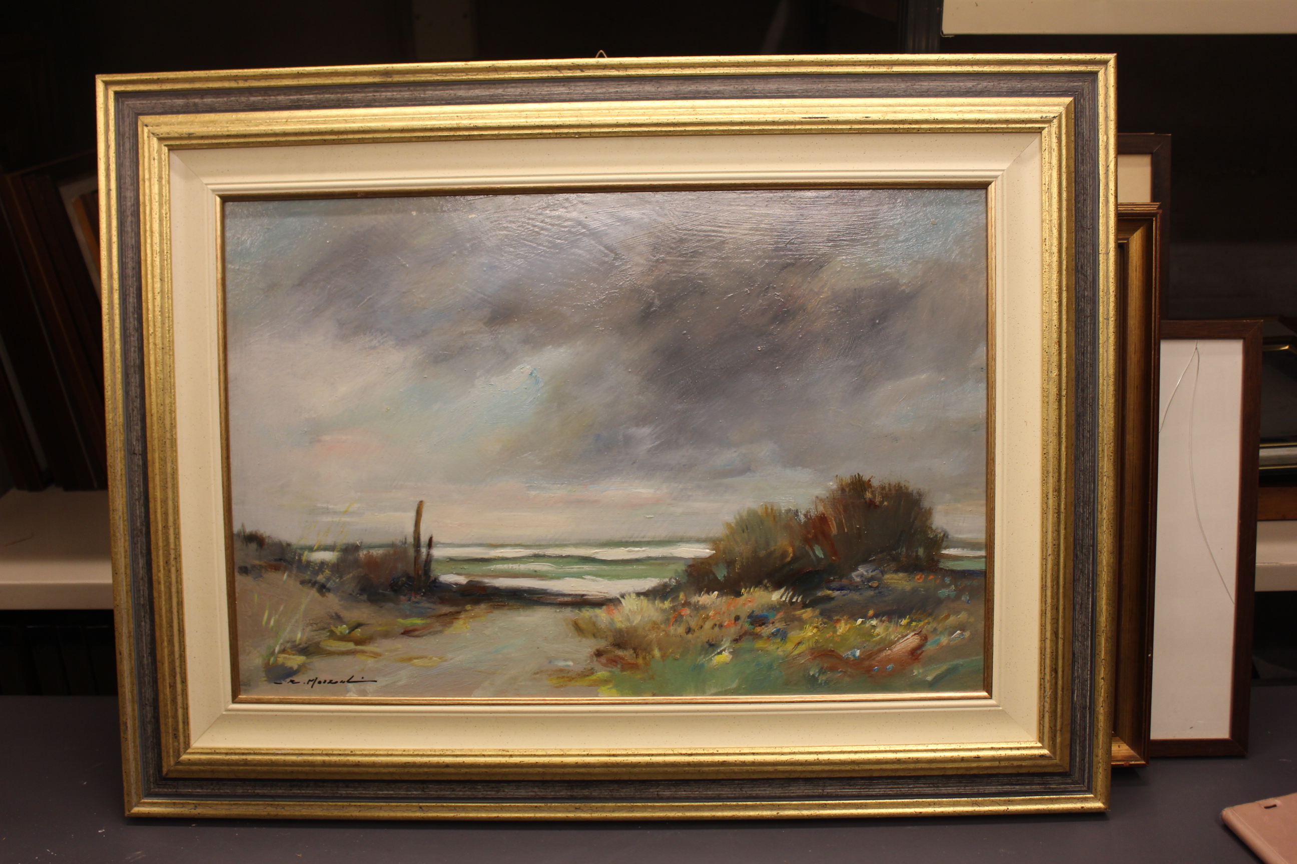 Dipinto ad olio su pannello di faesite inserito in una doppia cornice, la più interna delle quali con battua liscia bianca e bordino interno dorato, la seconda più esterna con fasce modanate dorate e verniciate (finitura color antracite). La scena rappresenta un tratto di mare e una piccola spiaggia raggiunta da una strada sterrata. A fianco della strada colori sgargianti di fioriture su un prato, vicino a degli arbusti, contrastano con il cielo plumbeo all'approssimarsi di un temporale.. Paesaggio: strada sterrata; arbustii; spiaggia; mare; canne; fiori. Fenomeni atmosferiti: temporale; vento