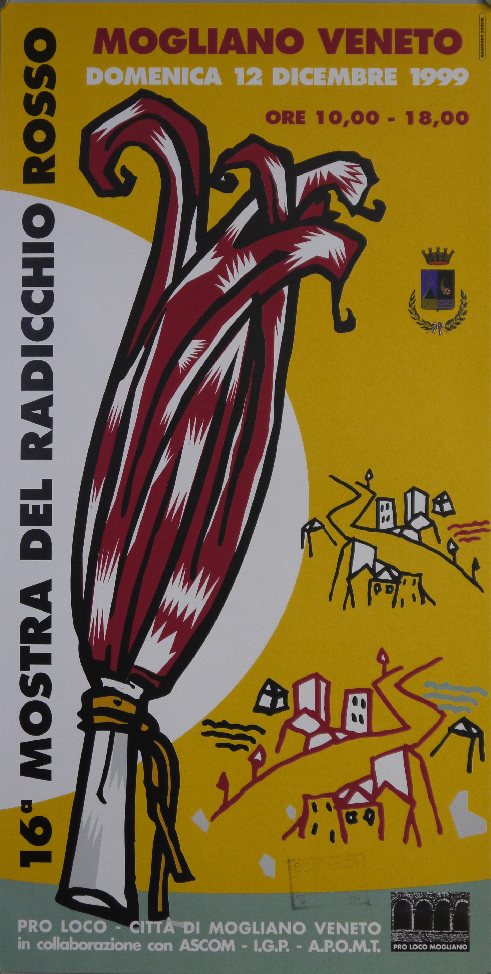 Lettura iconografica: cespo di radicchio rosso tardivo di Treviso; case; strade; alberi; campi. Categoria merceologica/tipo evento: evento culturale; mostra agricola; cultura e conoscenza del territorio. Nomi: Raimondo Sandri; Pro Loco - Città di Mogliano Veneto; ASCOM; I.G.P.; A.P.O.M.T.. Luoghi: Venezia; Mestre