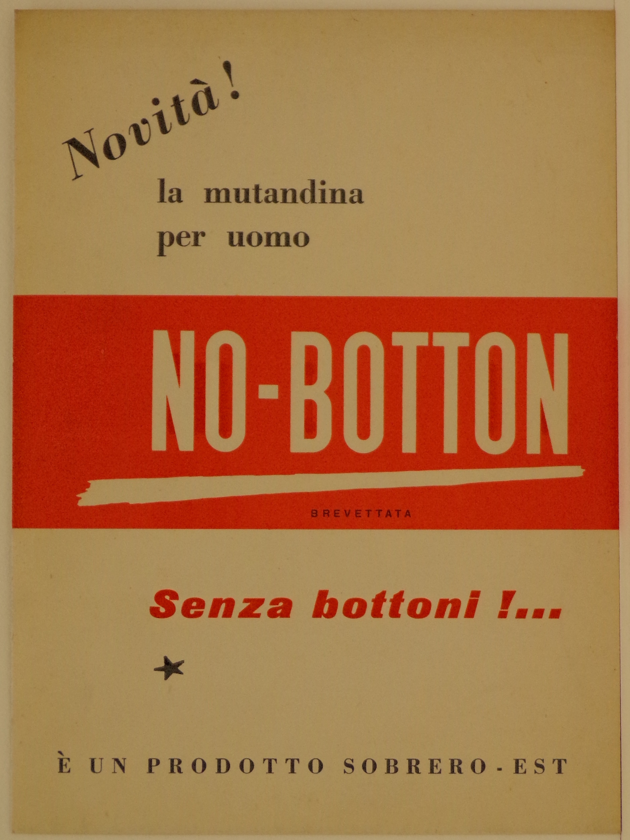 Lettura iconografica: impaginato astratto con fascia mediana rossa su fondo bianco. Categoria merceologica/tipo evento: industria del tessile e dell'abbigliamento.Nomi:Sobrero-Est. Luoghi: -