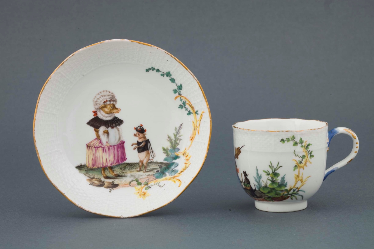 Forma caratterizzata dal rilievo Altozier, consistente in un bordo lavorato con trama in vimini; decorazione policroma con immagini di animali fantastici: in un paesaggio si stagliano un cinghiale in abiti femminili e un maialino in abiti maschili. Bordo dorato. . ANIMALI FANTASTICI: CINGHIALE; MAIALINO. PAESAGGIO