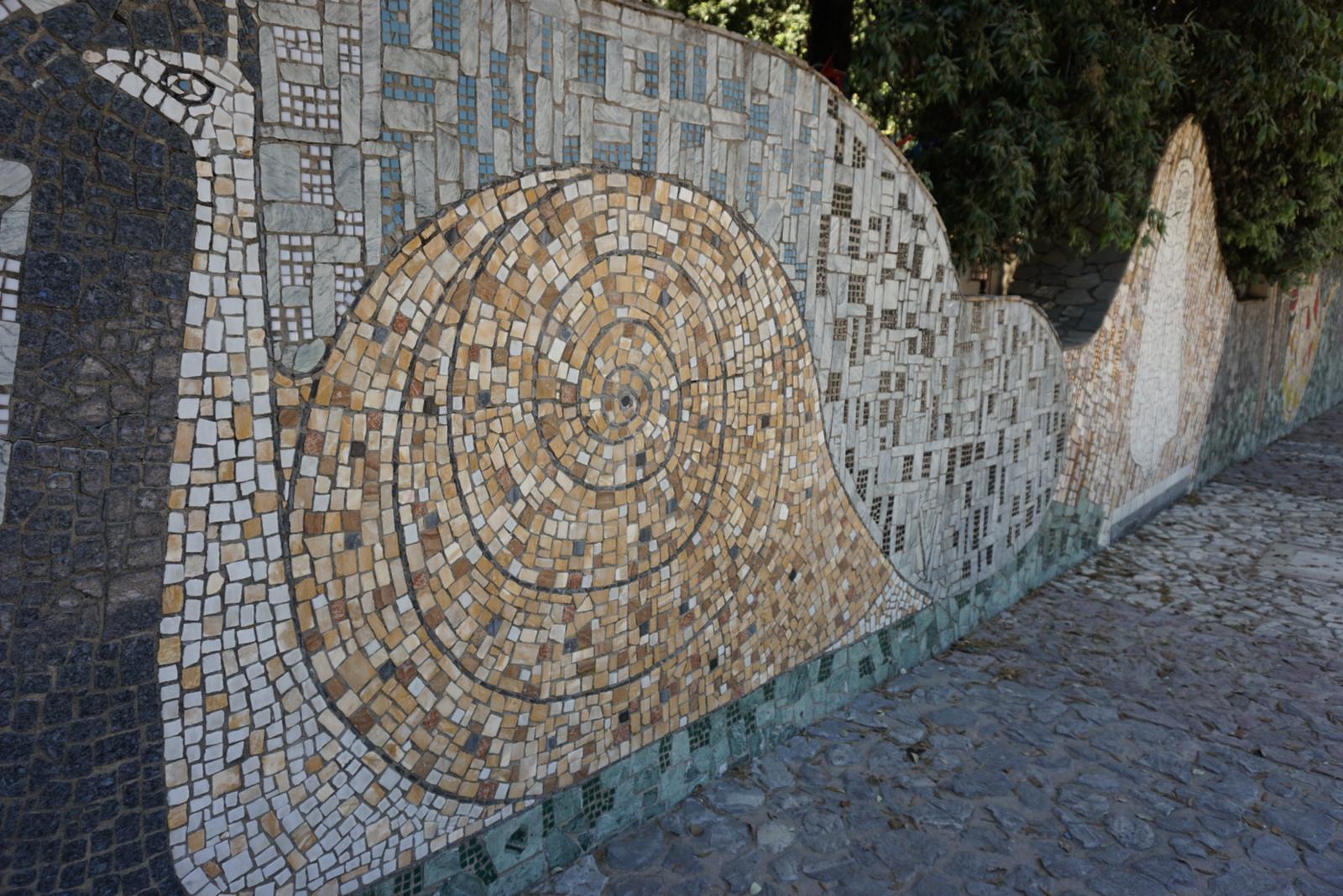 Mosaico rappresentante una lumaca dal guscio marrone a spirale, il corpo allungato verso l'alto crea una grande ombra nera. Ha l'occhio azzurro e una antenna. Occupa completamente una la parete