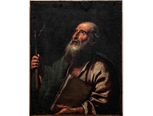 Il dipinto olio su tela raffigura San Simone il Cananeo. Su fondo bruno, l'effige del vecchio santo dalla lunga barba, a mezzo busto, in posizione di tre/quarti. E' vestito di un ampio saio color nocciola e porta un drappo sulla spalla. Si appoggia ad un bastone ed ha lo sguardo in estasi rivolto verso l'alto; con la mano sinistra tiene un libro.. Personaggio: Apostolo Simone il Cananeo. Oggetti: libro; bastone