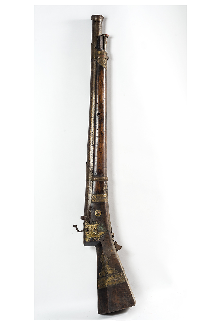 Archibuso a miccia (tufenk). Attorno al calcio veniva arrotolata la miccia, mentre il serpentino agisce in una fenditura del calcio e il copriscodellino ruota su un perno. Cassa romboidale con applicazioni in metallo dorato lavorate ad arabeschi, così come le due fascette di fissaggio.. n.d