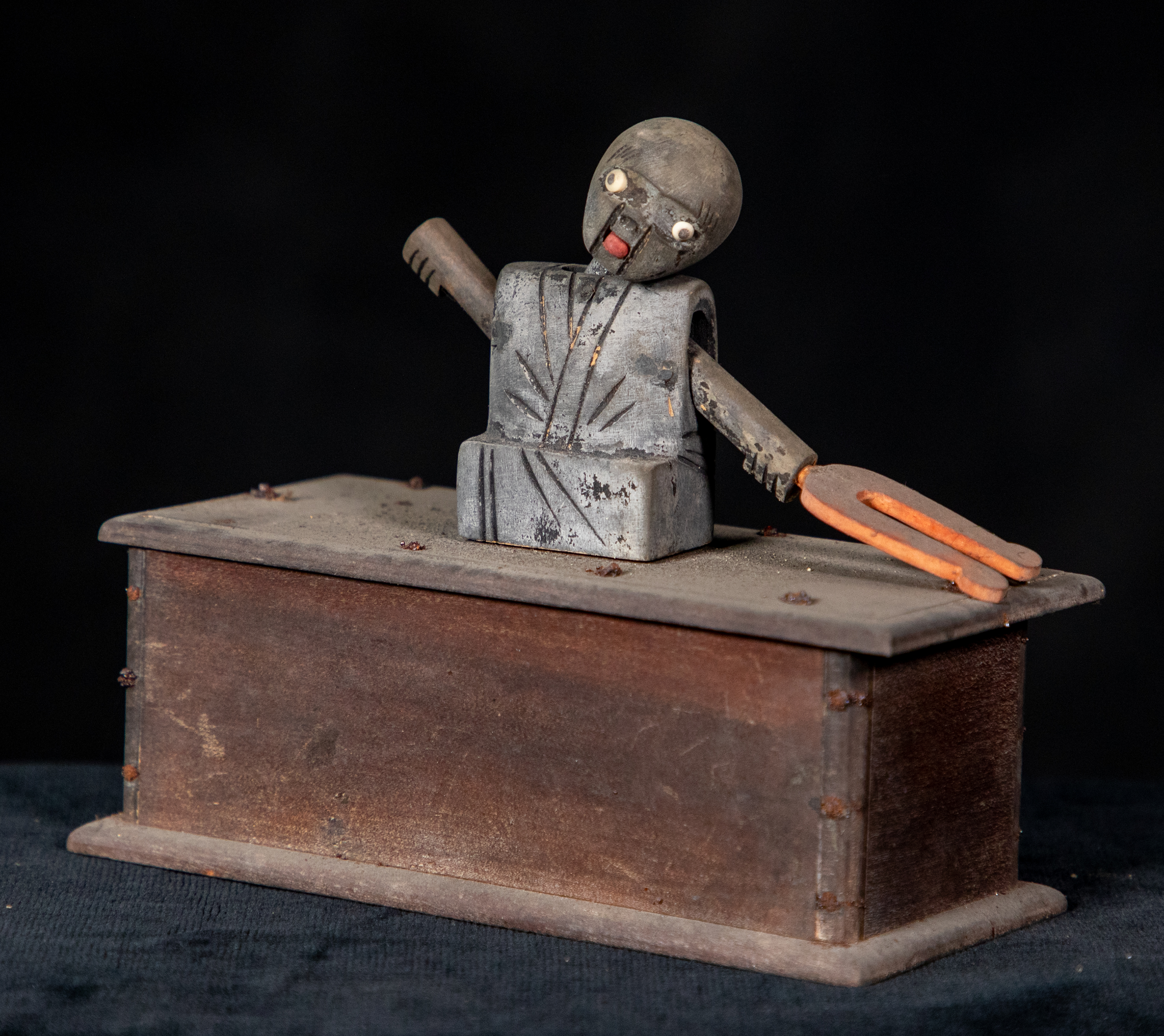 Scatolina di legno dotata di leva che aziona, tramite corde interne, il movimento di alcune parti della figura (testa e braccia) seduta sulla parte superiore. Il personaggio, un essere mutaforma (obakemono) o un fantasma (yūrei) in kimono, è intento a lavorare con le tenaglie del mestiere nella mano sinistra.. Essere soprannaturale: fantasma; Figura: seduta; Oggetti: tenaglie da fabbro