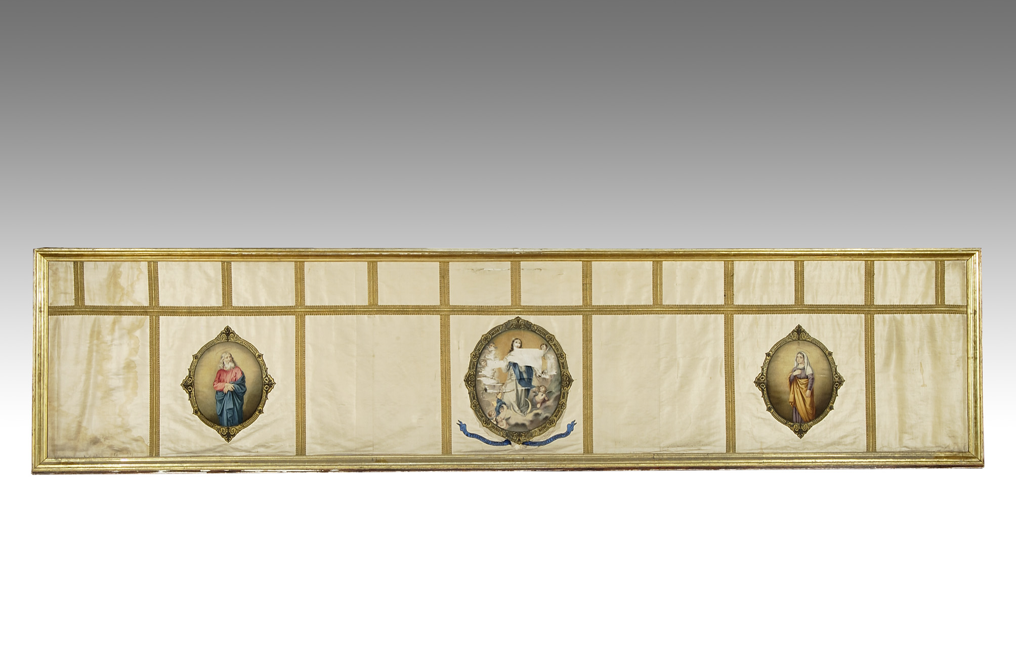 Il tessuto di colore beige presenta tre tondi dipinti uno con la figura disan Gioacchino in veste rossa e mantello blu, uno con la Madonna in vestebianca e manto azzurro fra angioletti, l'altro con sant'Anna in velo bianco, veste viola e manto color oro. Il gallone è in seta gialla e oro lamellare tessuti a telaio. La fodera è in tela di lino bianco. Il paliotto presenta una cornice in legno intagliato e dorato.