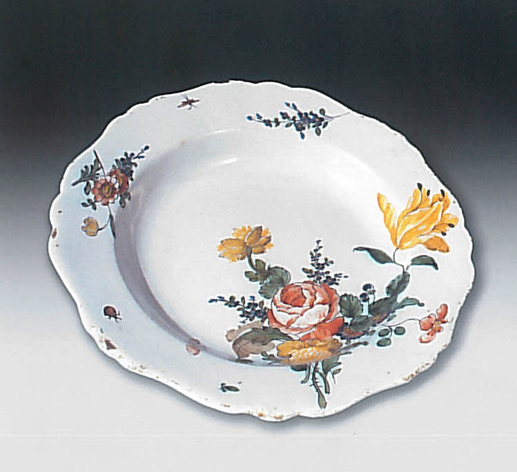 Il piatto presenta un bordo centinato e smerlato. Lo smalto è bianco lucido.. Una raffinata decorazione floreale campisce una parte del manufatto; compongono il decoro una rosa in rosso vivo, fiori in giallo intenso e foglie in verde. Sulla tesa sono campiti gruppi policromi di piccoli fiori e decori fitomorfi in verde scuro, intervallati da insetti