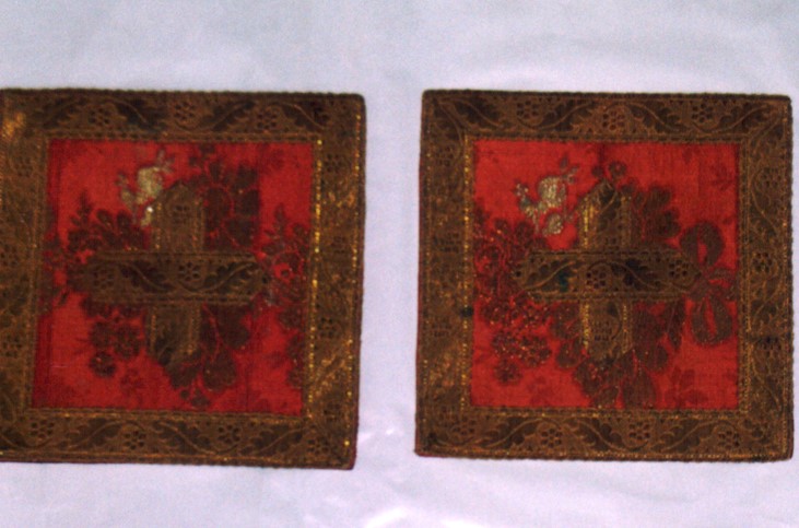 Le borse liturgiche, parti del paramento costituito dalla bellissima pianeta descritta precedentemente, utilizzano un tessuto settecentesco operato in raso di seta color paonazzo lavorato a damasco con fitti serti fioriti su cui si sovrappongono, con un'eccezionale effetto di risalto e rilievo per la lavorazione a broccato a fili d'oro, decori a meandro fiorito che formano anse e rose qui non visibili nell'interezza del disegno in relazione alla limitatezza del campo. Sono visibili i piccoli fiori in filo d'argento, che fanno parte dell'ornato del tessuto originario e che danno risalto ulteriore al già ricco decoro. Sul raffinatissimo tripudio decorativo si sovrappone un gallone ottocentesco a telaio, che costituisce la perimetrazione e con cui è realizzata una semplicissima croce greca. Se ne deduce che il confezionamento del manufatto è da farsi risalire ai primi del secolo XIX con tessuto di riuso.. Motivi decorativi a meandro fiorito/ rose/ serti fioriti/ gallone tessuto a motivo fogliato/ croce greca/ motivo a fiocco in una delle due borse