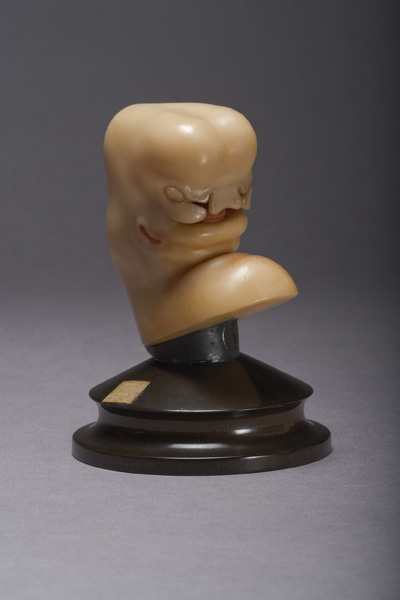 Rappresentazione ingrandita di una fase di sviluppo della testa e del collo dell'embrione umano. Modello in cera policroma appoggiato su una base lignea dipinta di nero.. Corpo Umano: Embrione